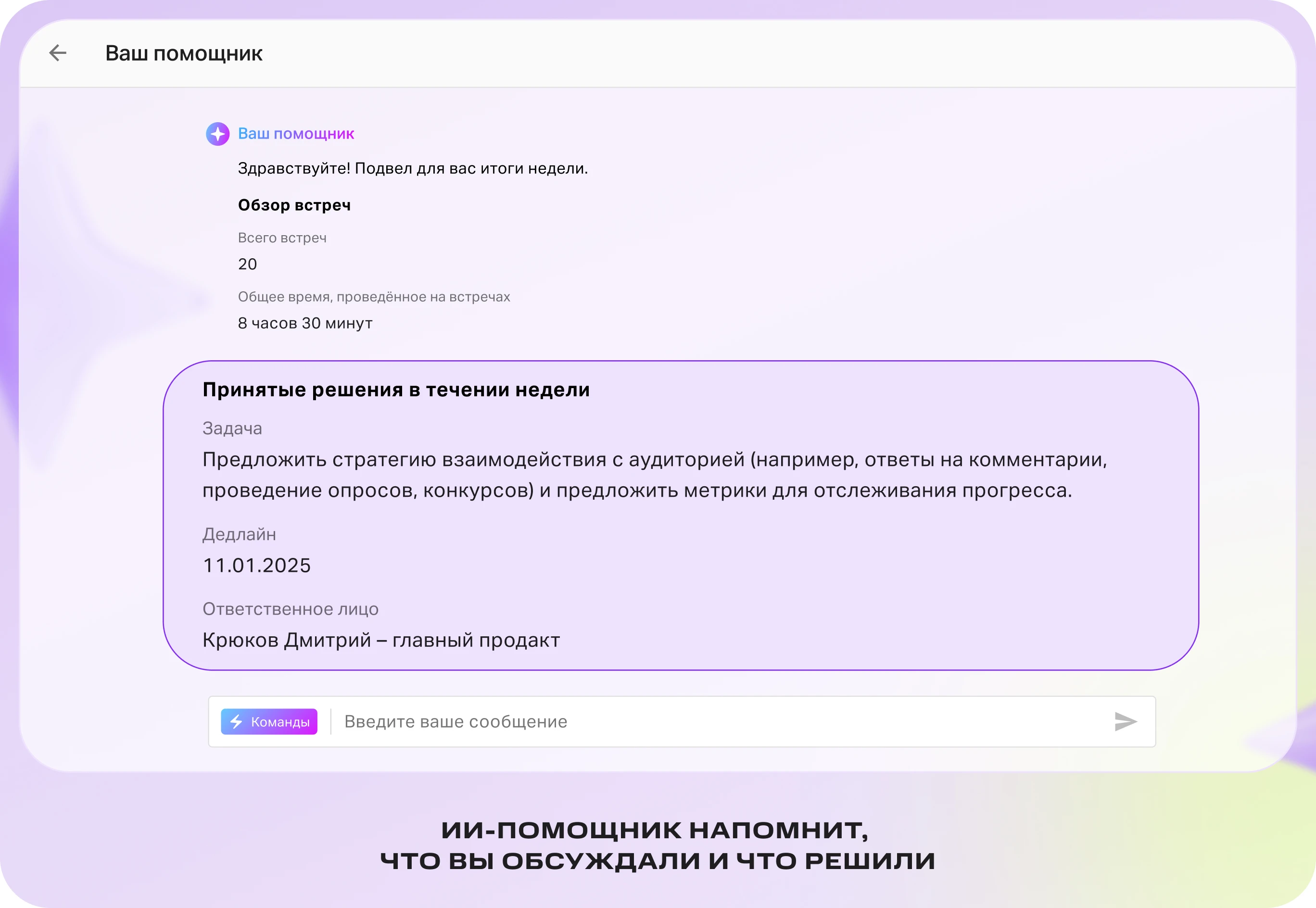 Ищет информацию в чатах и встречах. Напоминает о принятых решениях и задачах