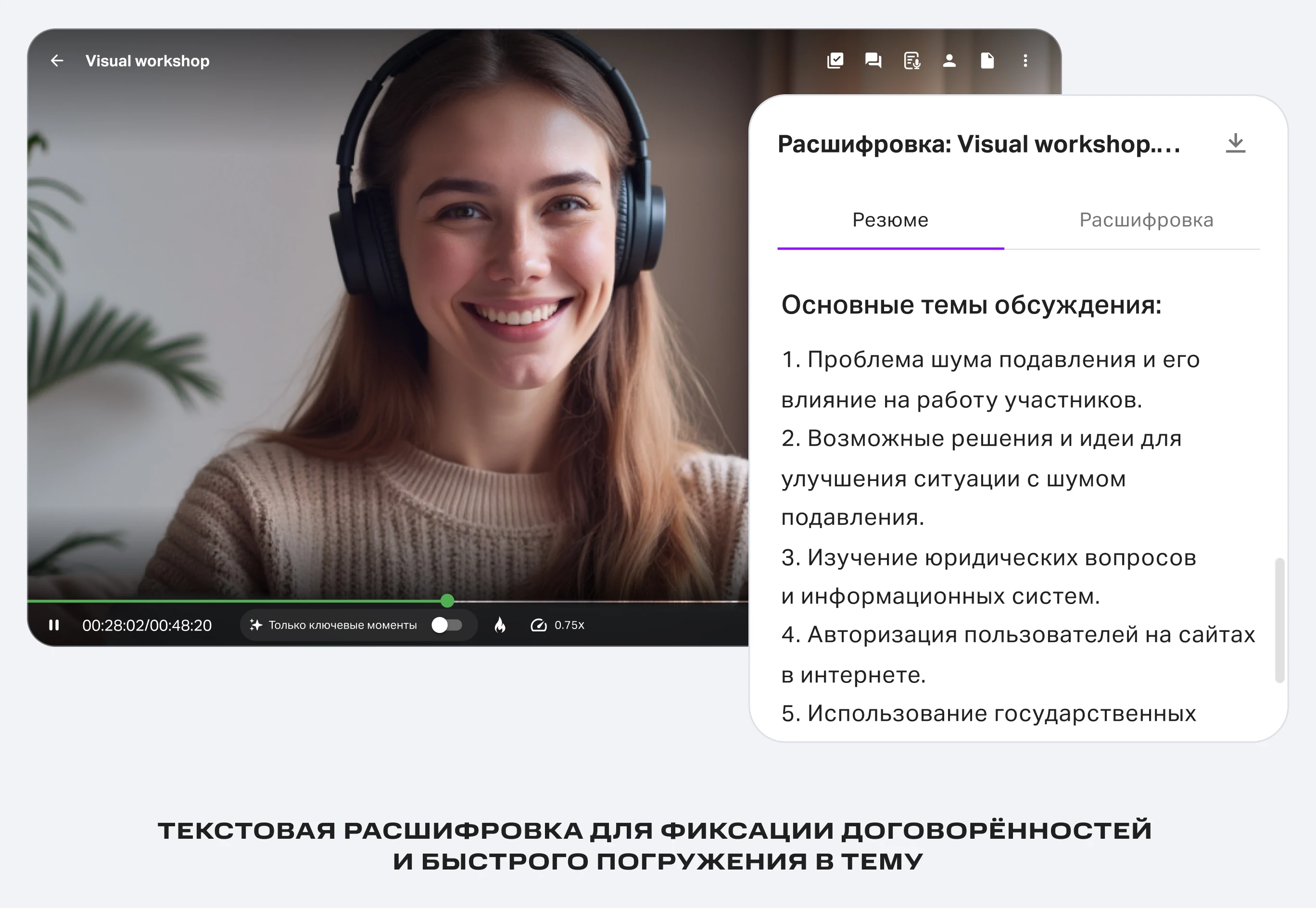Ищет информацию в чатах и встречах. Напоминает о принятых решениях и задачах