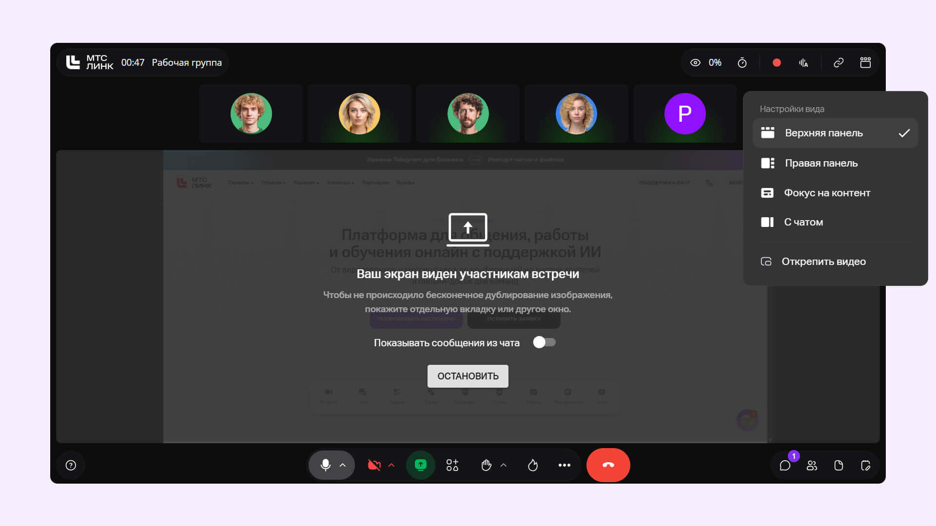Также мы обновили режим «Картинки в картинке», когда встреча сворачивается в маленькое окно поверх остальных окон на устройстве. Теперь тут отображается до 30 участников, а ещё можно запускать и останавливать демонстрацию. Функцию особенно оценят те, кто часто проводит презентации: следить за реакцией аудитории теперь станет проще.
