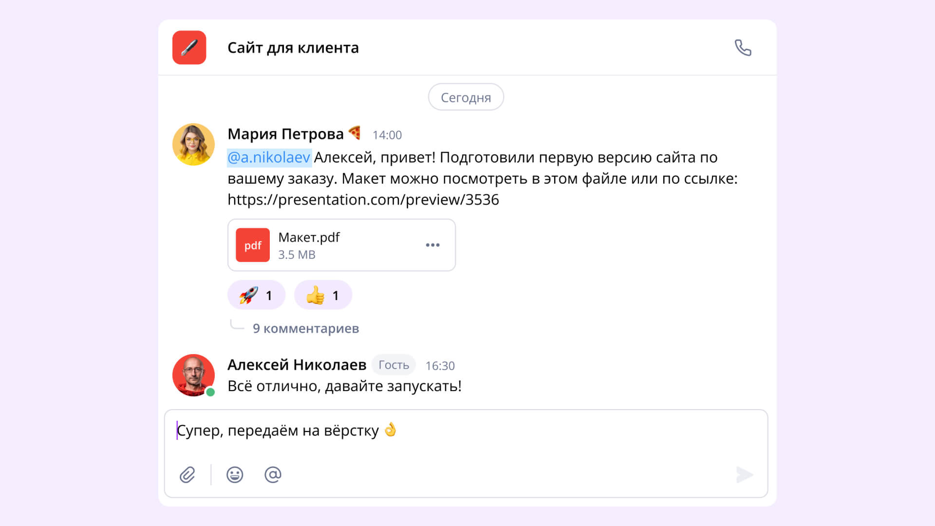 Теперь команда может общаться с клиентами и подрядчиками в одном рабочем мессенджере