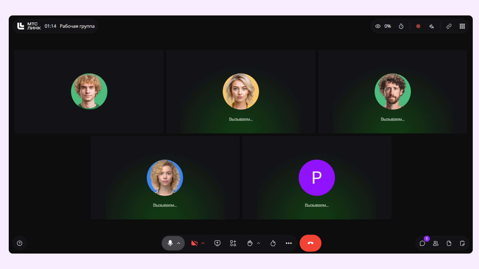 Новая комната видеозвонков сохранила все привычные функции, но расположение кнопок стало другим. Теперь начать и завершить встречу, показать экран, включить запись и расшифровку стало на 68% быстрее, чем раньше. Всё это — за счёт новой центральной панели с ключевыми действиями и логичного расположения разделов с индикаторами и активностью сверху.
