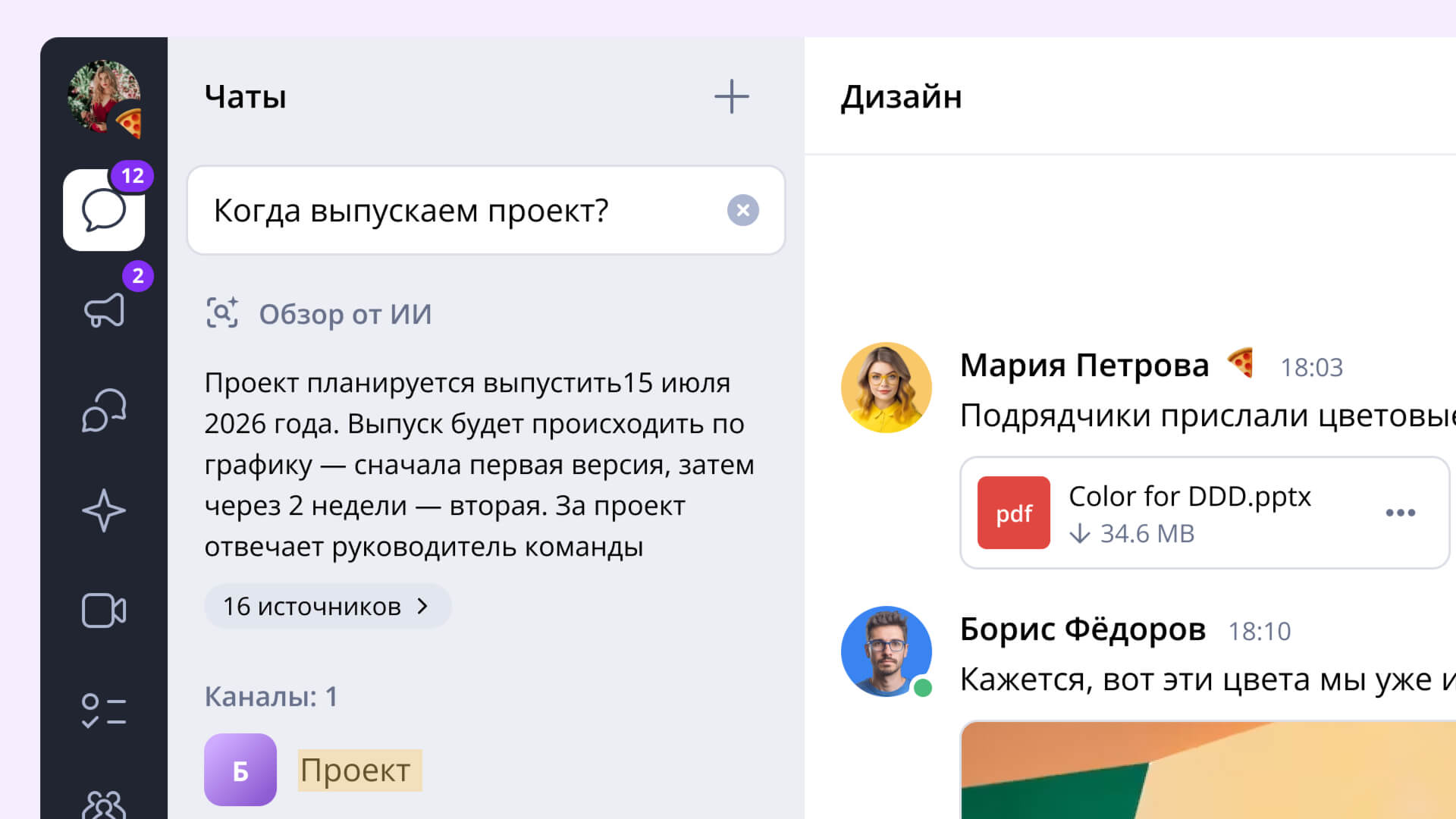 Также упростить работу сможет поиск с ИИ. Достаточно ввести запрос как в поисковик, а затем получить краткий ответ на основе доступной информации из организации. Например, можно спросить, какая у коллеги должность, какие проекты сейчас запущены у отдела маркетинга и где проводят корпоратив в этом году. Всё это — с указанием источников из чатов и каналов.