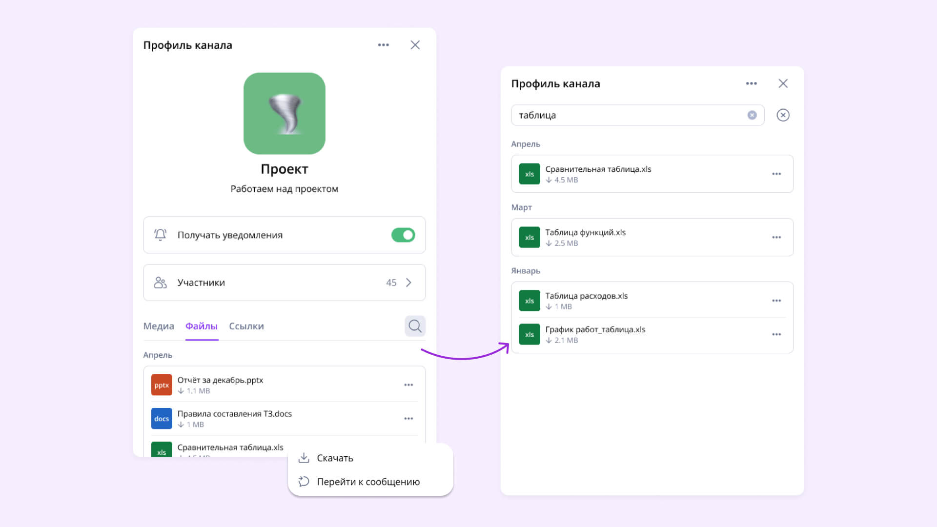 В любом рабочем чате со временем накапливается много данных: файлов по проектам, ссылок на документы, скриншотов и изображений. Закрепление сообщений поможет держать всё важное перед глазами, но, кроме этого, теперь есть и медиатека — список всех файлов в профиле канала или чата. В ней хранятся все медиафайлы, которые когда-либо отправлялись в чате. Также из медиатеки легко перейти к сообщению, чтобы вспомнить контекст.