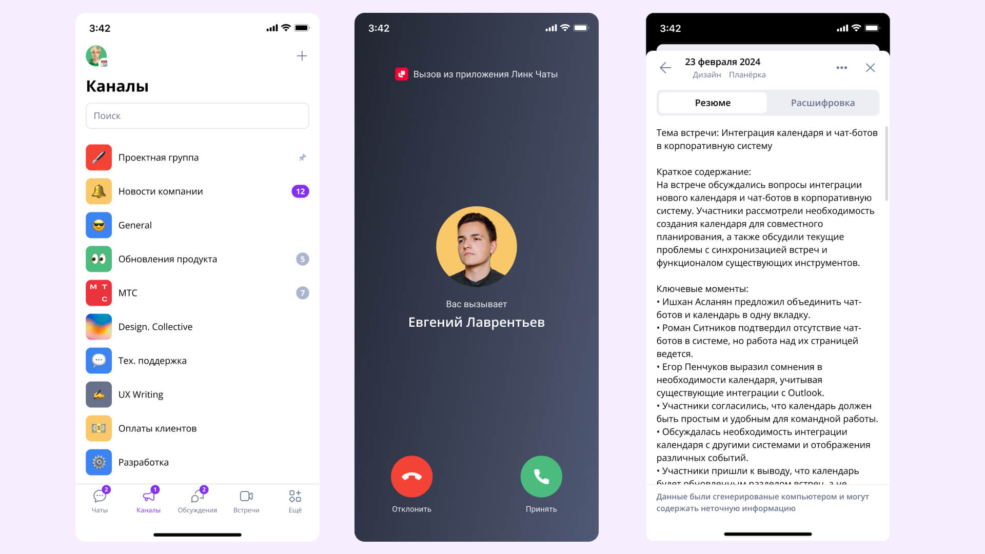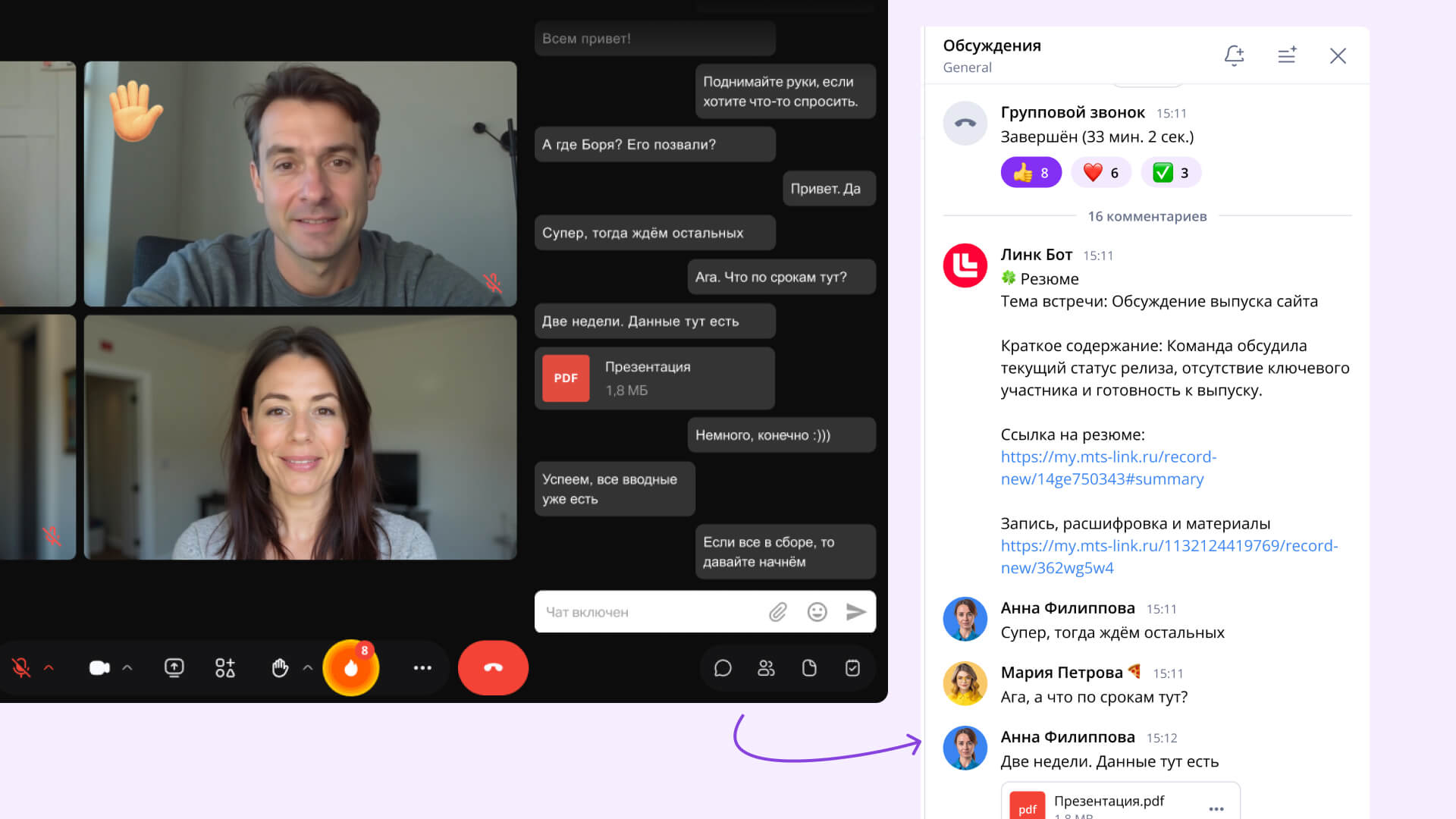 коммуникации не потеряются — переписка с онлайн-звонка приходит в чат корпоративного мессенджера вместе с расшифровкой и всеми артефактами