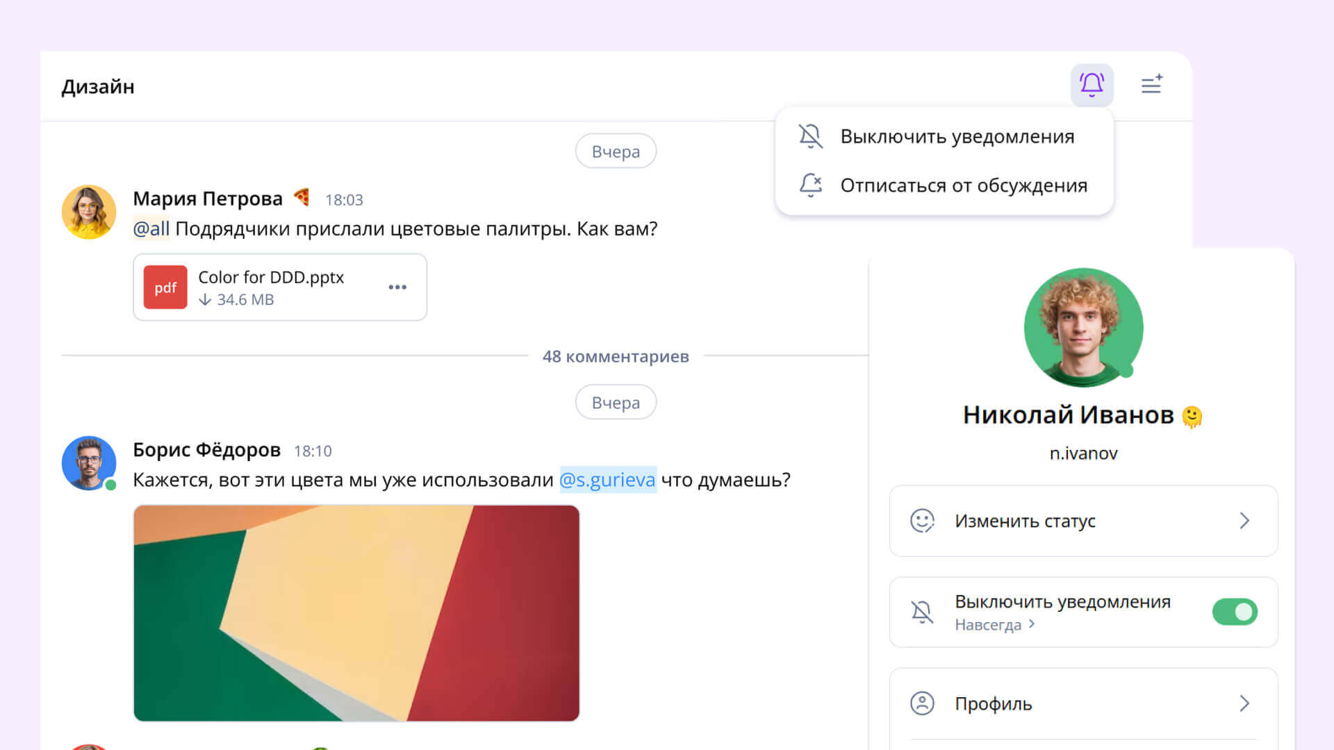 Во-вторых, теперь вы можете отключить все уведомления одной кнопкой — она находится в вашем профиле. Это полезная вещь, чтобы сфокусироваться на задаче и не получать лишних уведомлений на выходных и в отпуске.