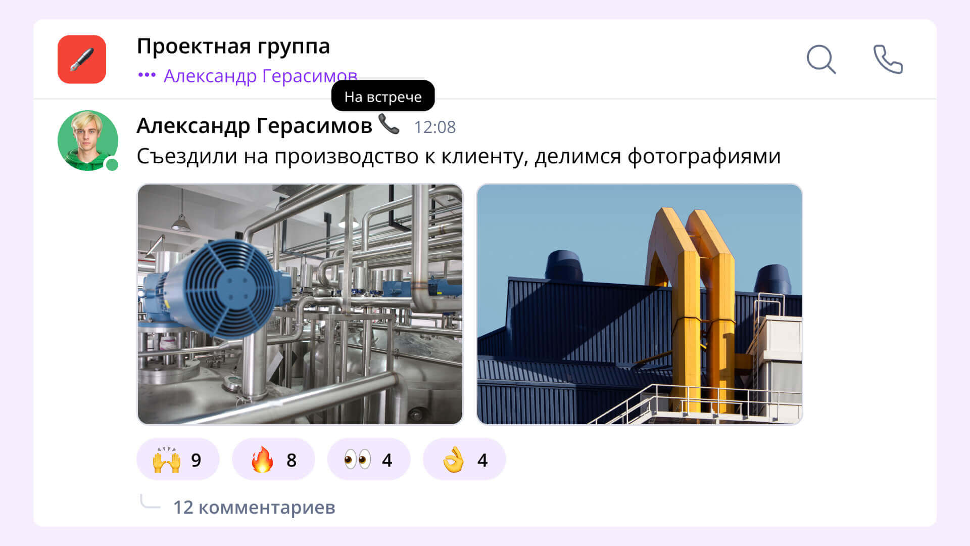 Также мы добавили функции, которые помогут проще координироваться с коллегами. Статус «Печатает» под названием чата подскажет, кто сейчас участвует в диалоге, а автоматический статус «На встрече» — кто из коллег на звонке.