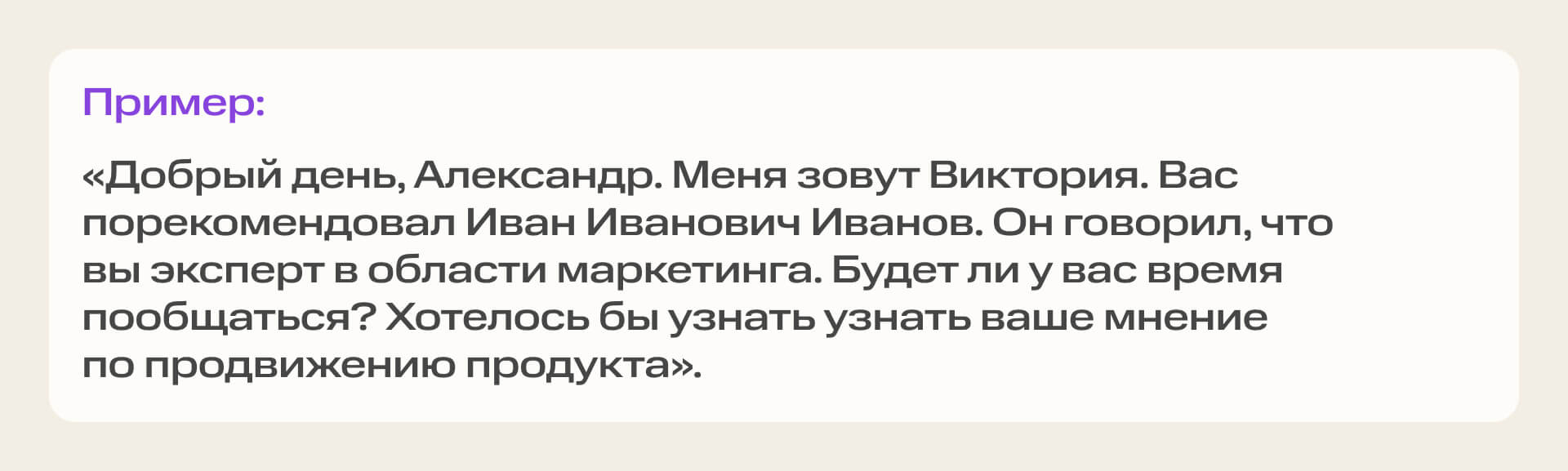 Почему работает? Вы обращаетесь к человеку персонально, это всегда располагает. Обозначаете цель общения с новым собеседником. Отмечаете, что уже знаете о коллеге общую информацию и настроены на дальнейшую коммуникацию. В то же время не давите и не проявляете излишнего напора.
