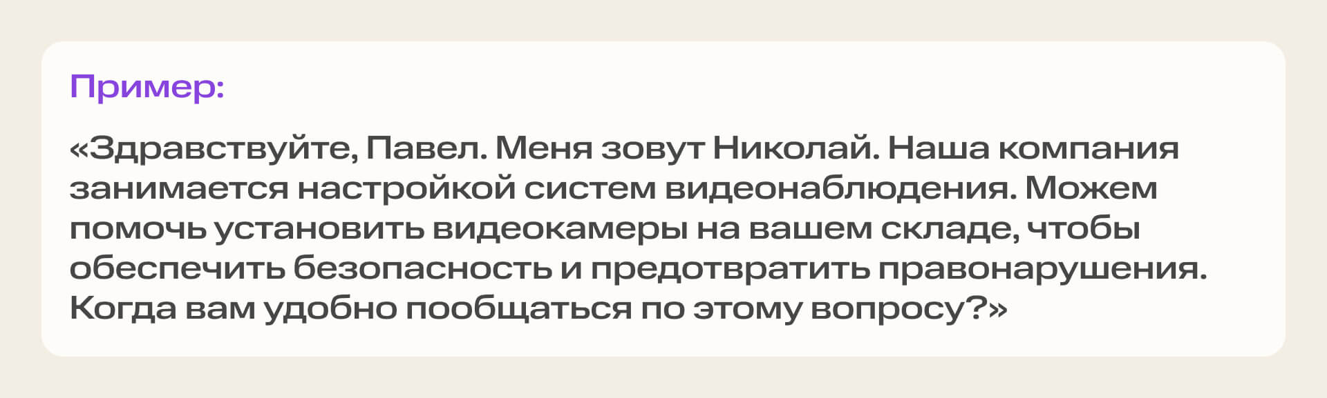 Фраза подходит для «прогрева» перед отправкой коммерческого предложения. Помогает установить контакт с потенциальным клиентом.