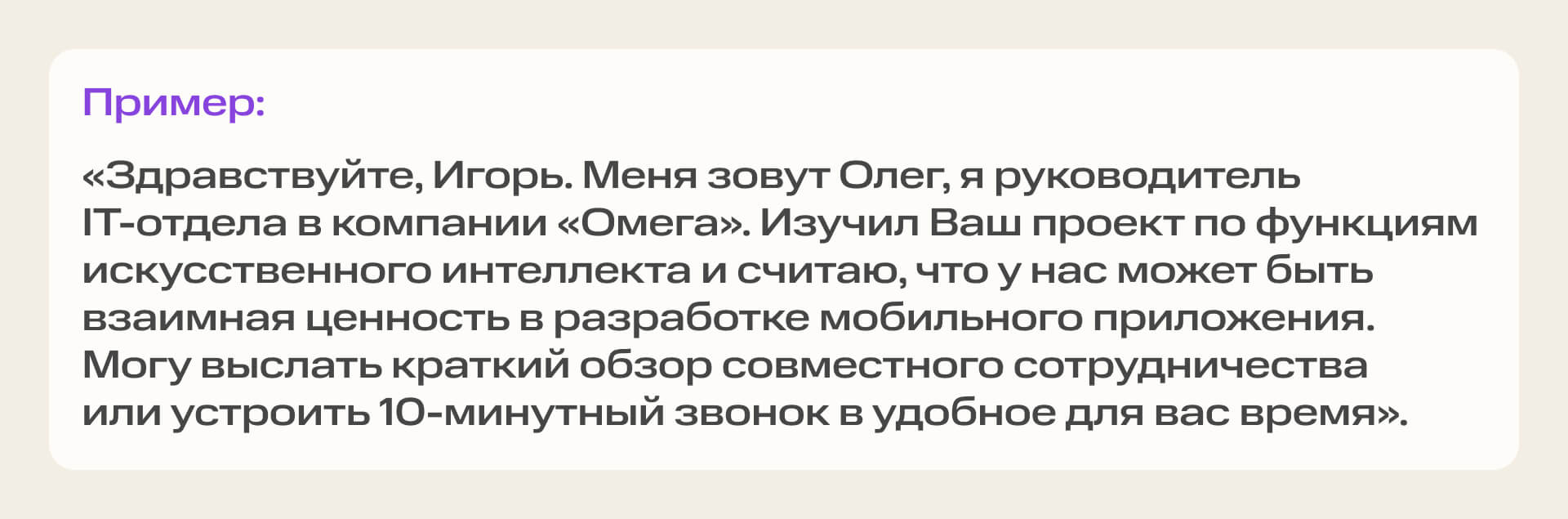 Почему работает? Налицо персонализация через конкретную тему. Фраза показывает, что вы не «случайный прохожий» и видите ценность во взаимодействии.