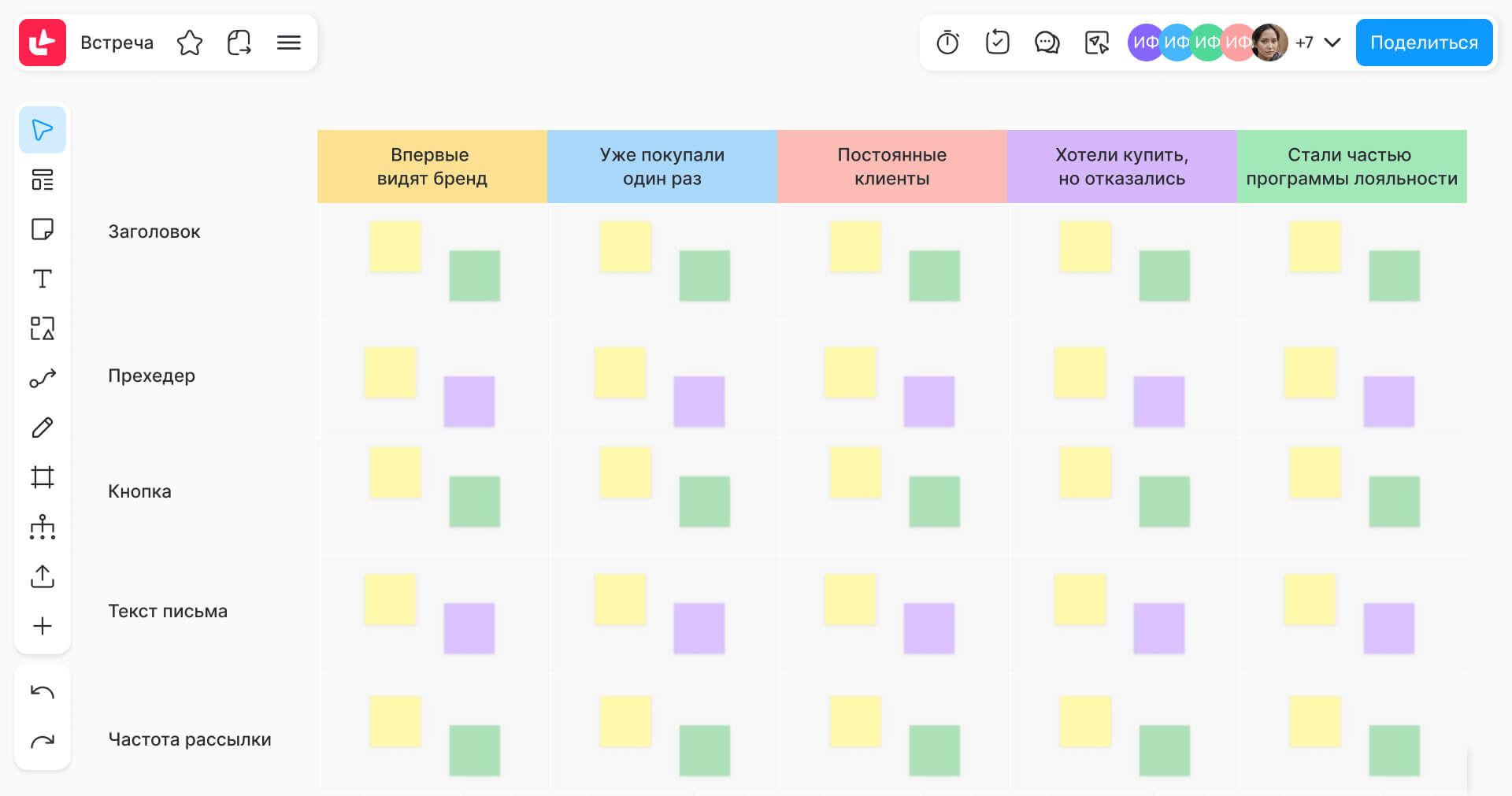 Полезным инструментом на этих этапах будут виртуальные доски. Например, в МТС Линк Досках все сотрудники могут не только визуально разбить на сегменты аудиторию, но и и предложить идеи по запуску кампаний, сделать несколько вариантов готовых рассылок для тестирования.