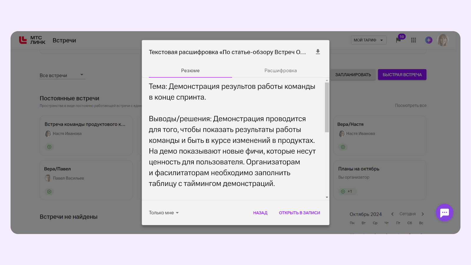 Резюме созвона в МТС Линк Встречах