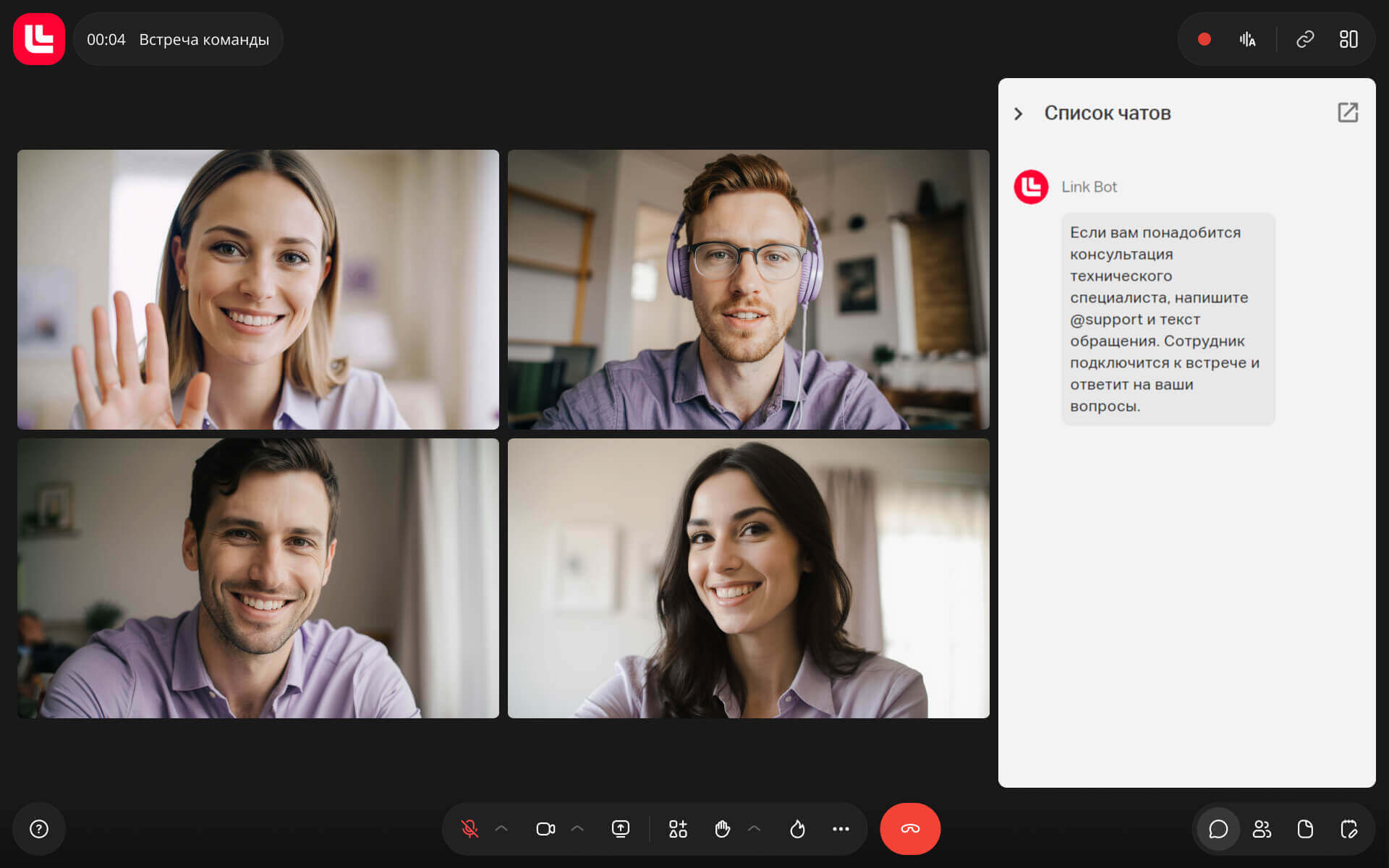 Чтобы встреча не затягивалась из-за того, что вы пользуетесь сервисом впервые, заранее изучите все функции и протестируйте их. Обязательно узнайте, как и с кем связаться, если технические проблемы возникнут во время встречи. Например, в МТС Линк Встречах можно обратиться к техподдержке прямо в чате онлайн-мероприятия — так вы сможете оперативно решить возникшую проблему.