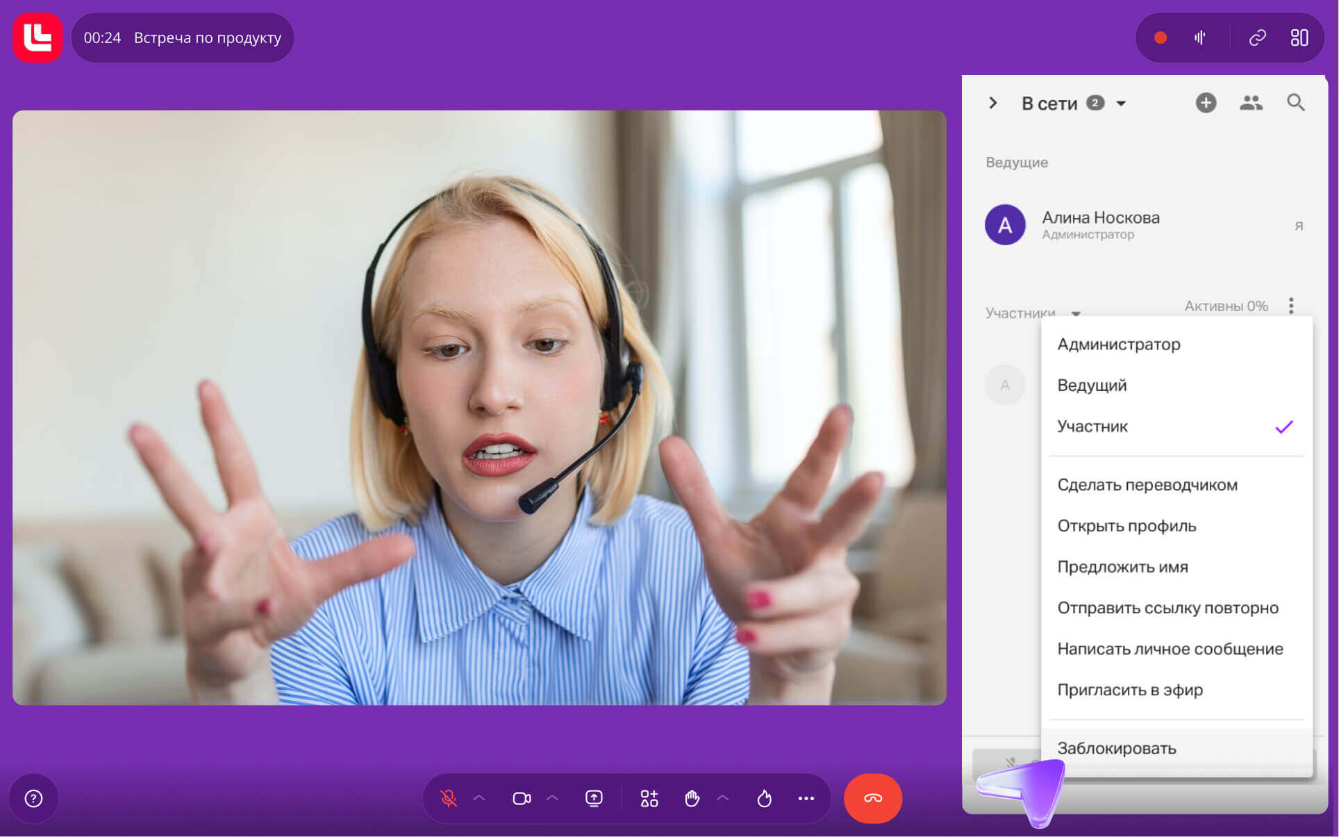 Чтобы заблокировать нежелательного пользователя в МТС Линк Вебинарах, откройте список слушателей, нажав на значок «Участники» на панели справа. Затем найдите в списке нужного пользователя, нажмите на иконку с тремя точками рядом с его именем и выберите опцию «Заблокировать».