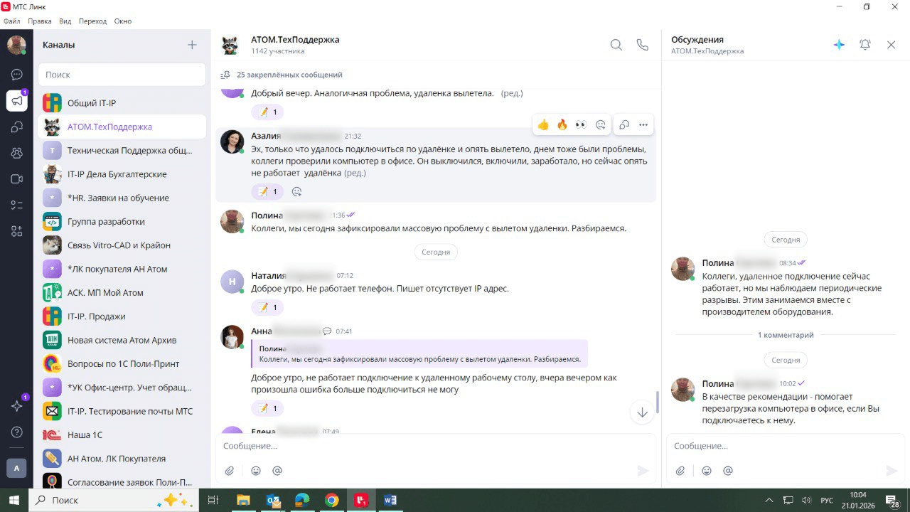 Канал технической поддержки «Атом» в корпоративном мессенджере