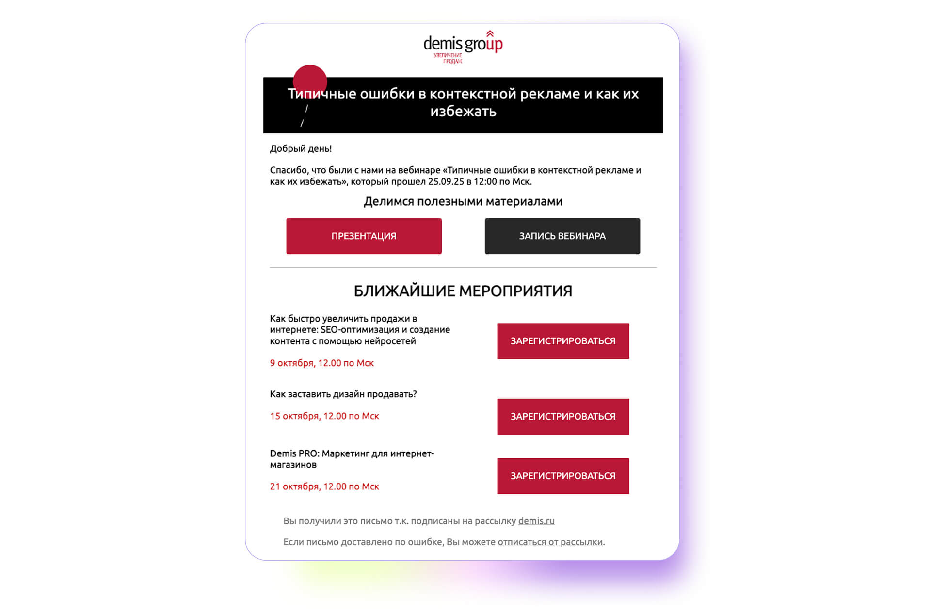 Пример письма digital-агентства Demis Group после проведения вебинара