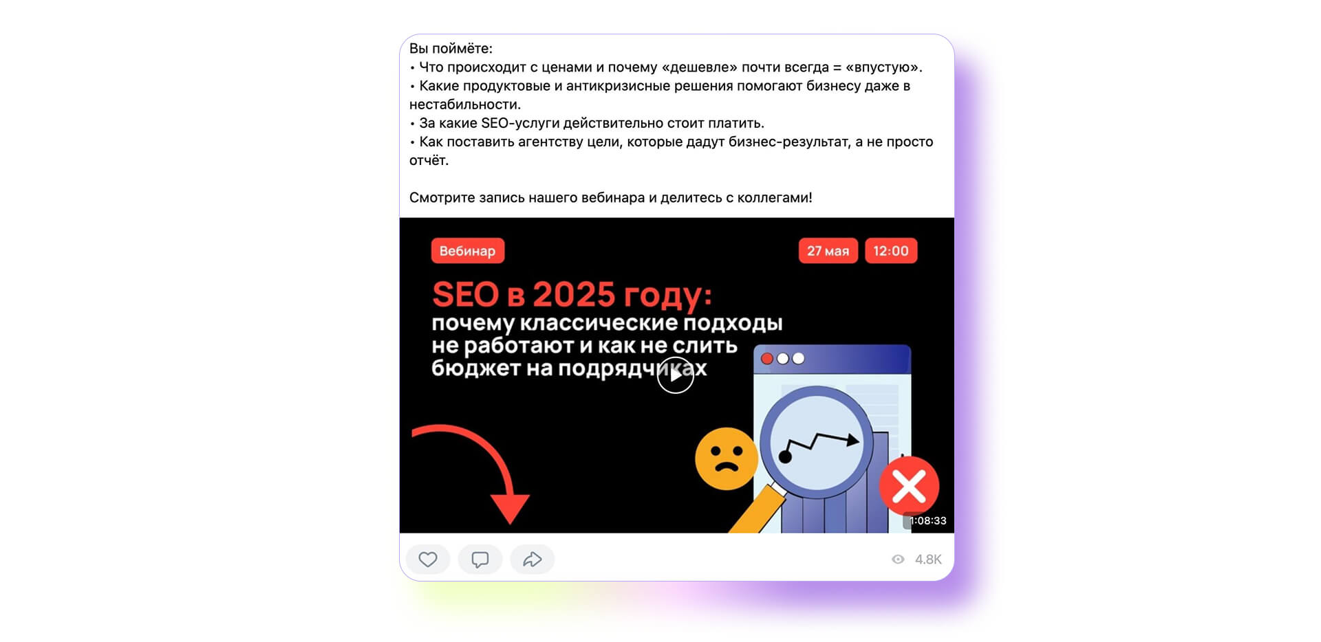 Контент вебинара идеально подходит для ретаргетинга и прогрева аудитории, которая уже проявила интерес, но пока не перешла к покупке.