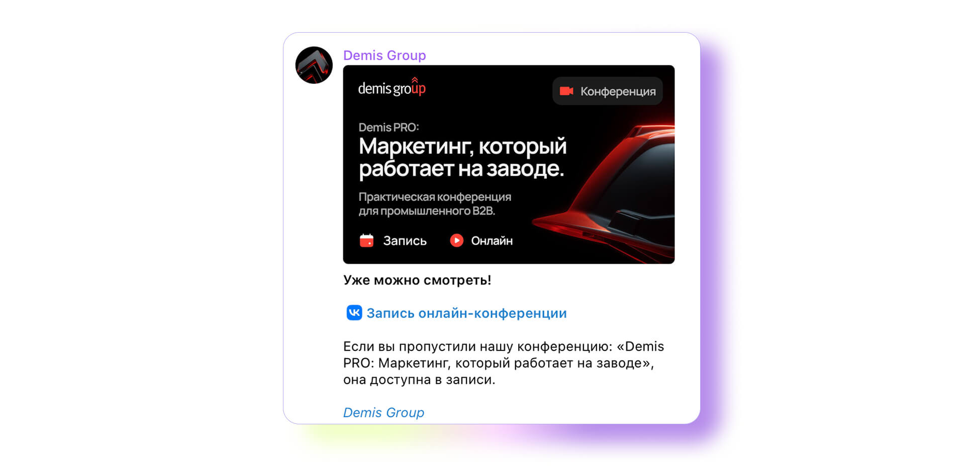 Например, мы проводили онлайн-конференцию «Demis PRO: маркетинг, который работает на заводе», и наш спикер делился кейсом. После мероприятия мы перевели кейс в текстовый формат и опубликовали.