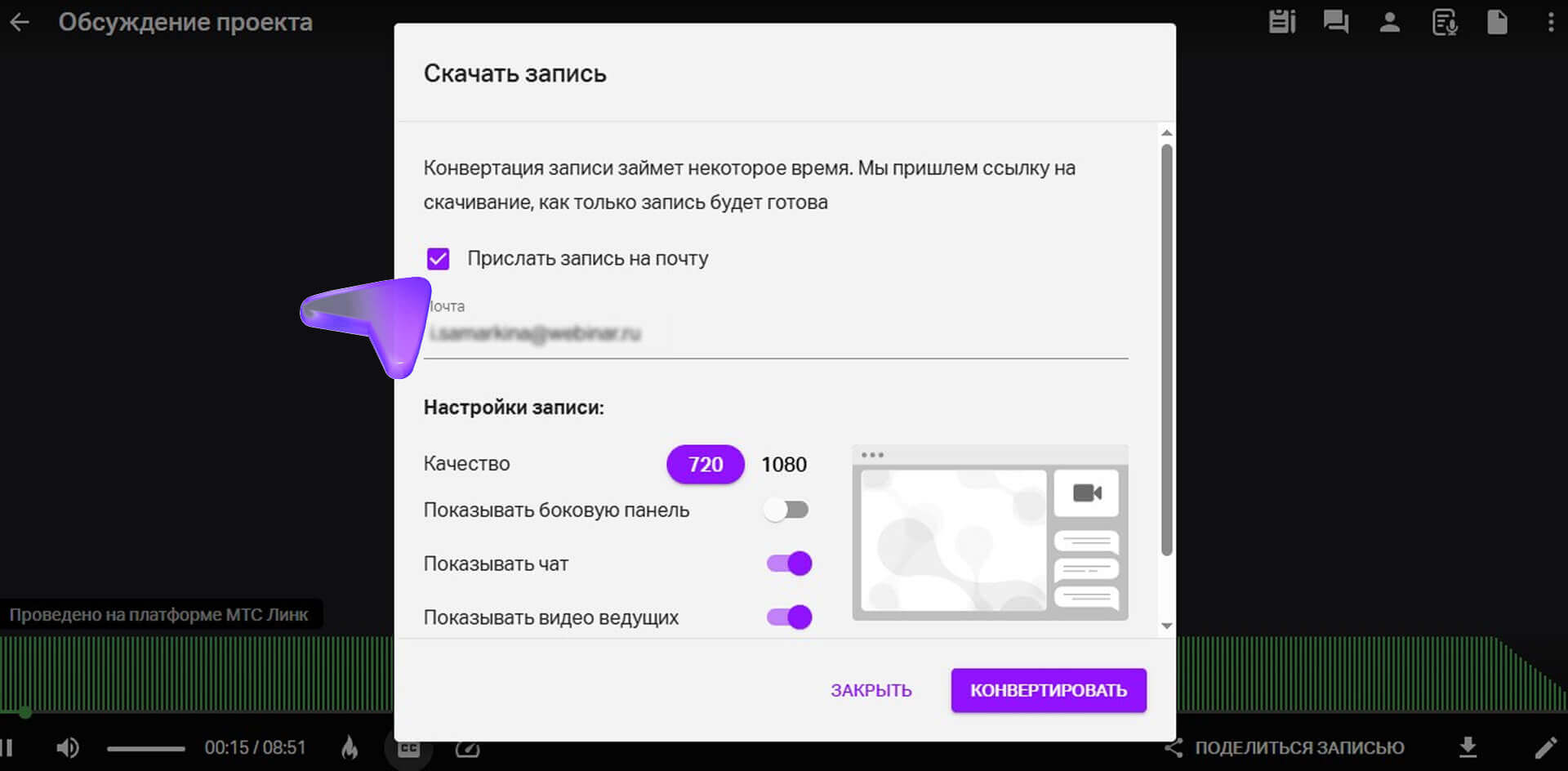 Поставьте галочку, чтобы ссылка на скачивание записи пришла на вашу почту