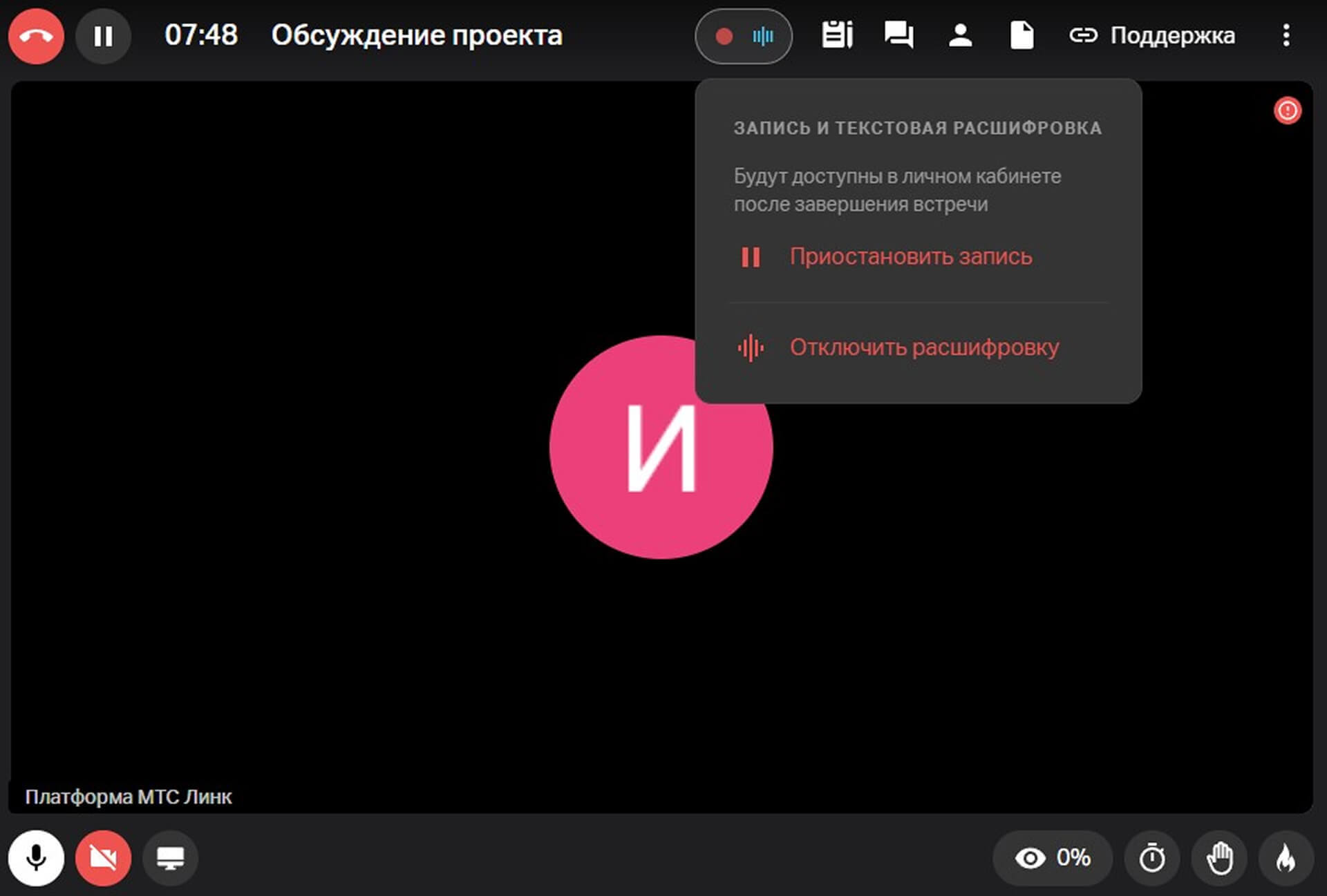 Запустите сервис МТС Линк Встречи и активируйте функцию онлайн-записи экрана. В верхней части экрана, справа от названия встречи, есть мигающая красная кнопка. Нажмите на неё, чтобы включить или отключить запись.