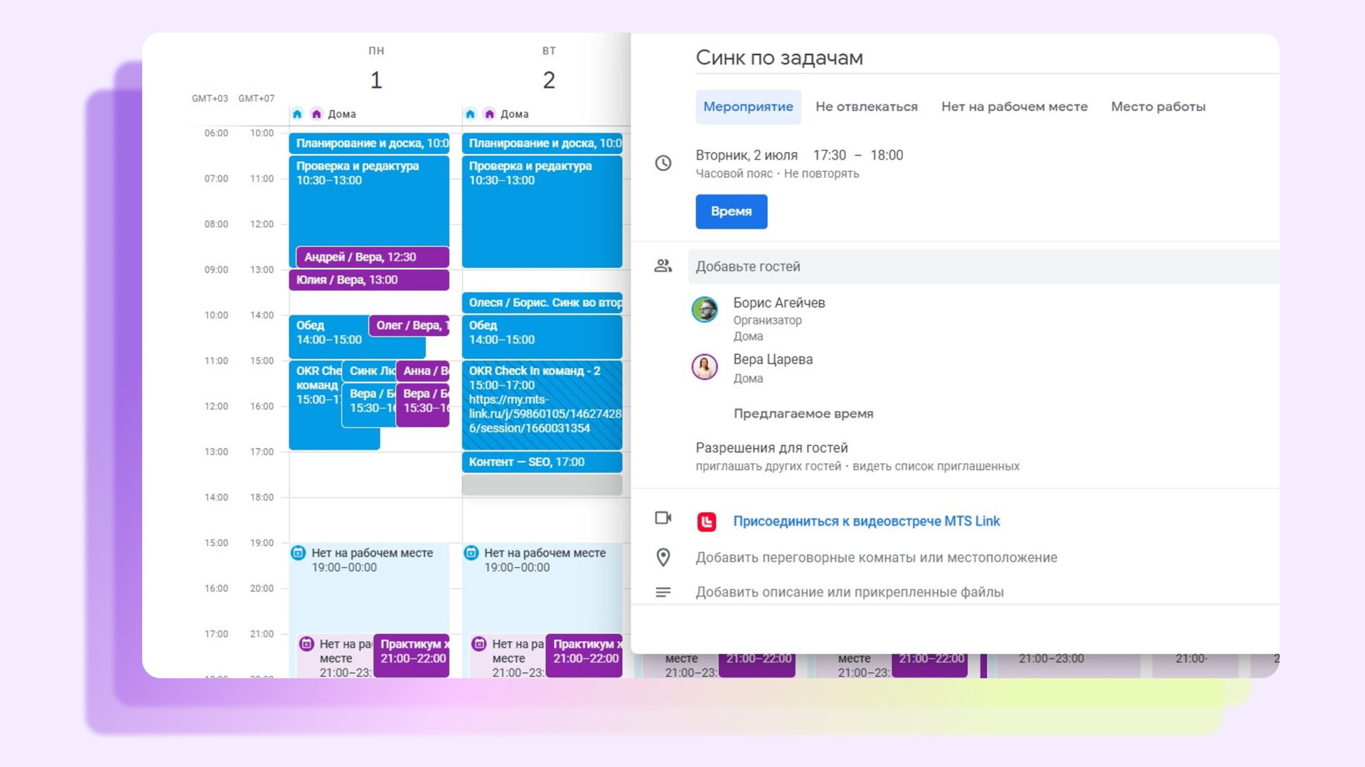 Они помогают назначать встречи без длительных переписок и составлять расписание на день. Например, вам необходимо созвониться с коллегой, чтобы обсудить задачу. Создайте в календаре встречу, выберите время и пригласите сотрудника.