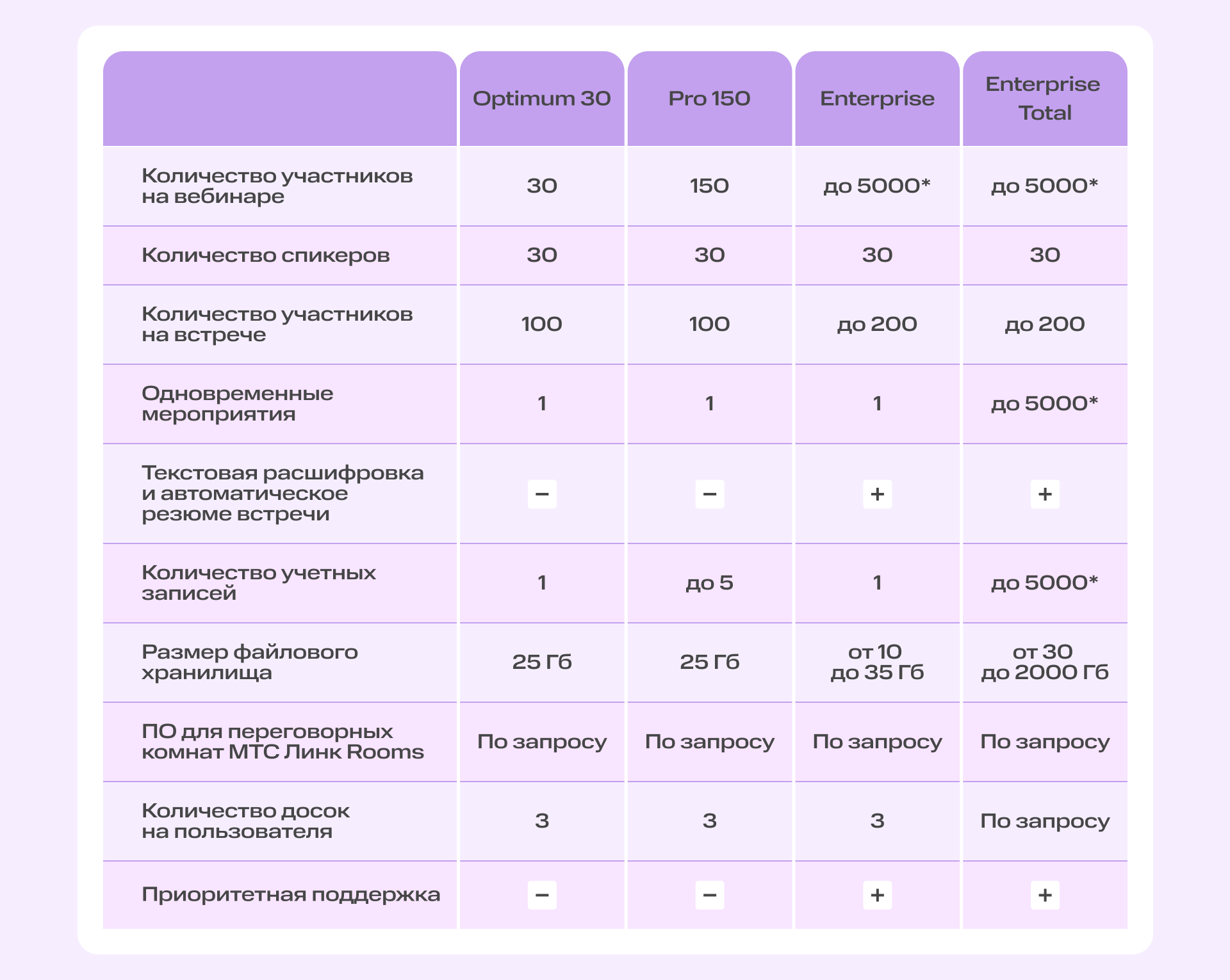 Тарифы Enterprise и Enterprise Total включают в себя дополнительно Вебинары, а также расширенную поддержку персонального менеджера. Он поможет с подбором инструментов, а ещё в коммуникации с продуктологами, техподдержкой и бухгалтерией МТС Линк.