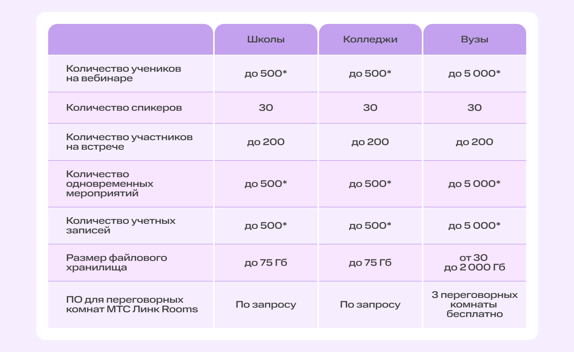 Сюда входит пакетное предложение «Вебинары + Встречи + Доски». Тарифы для образовательных учреждений включают в себя продукты МТС Линк для организации комплексного дистанционного обучения — с потоковыми лекциями, практическими занятиями, совместной работой учеников и онлайн-экзаменами.