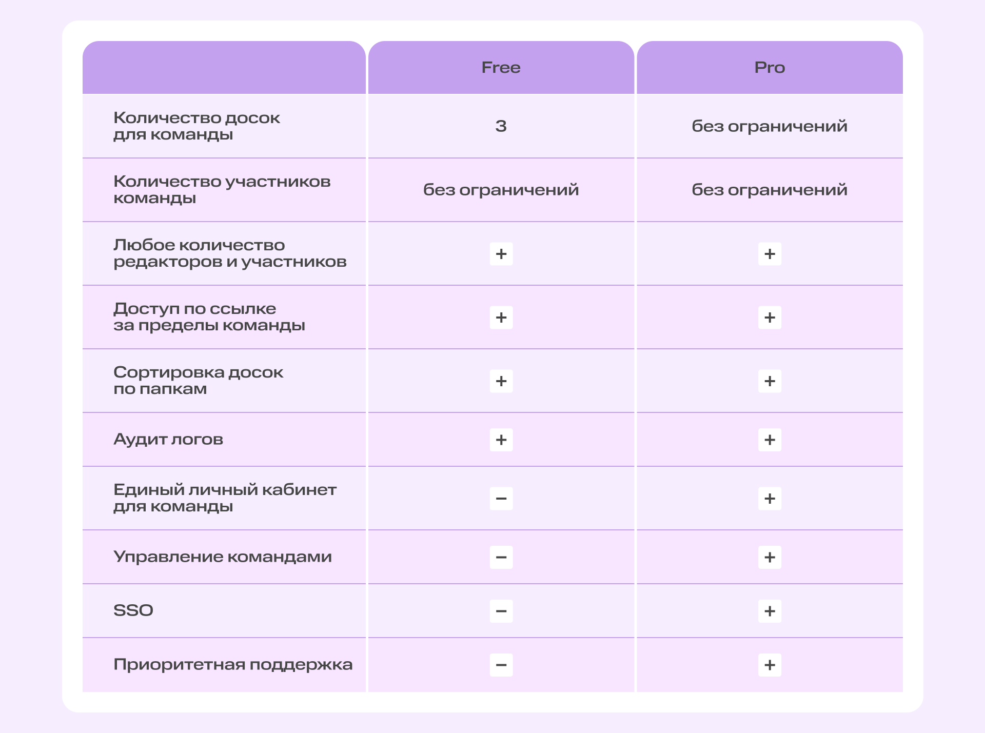 Основное отличие тарифов — в количестве доступных онлайн-досок, настройках администрирования и скорости техподдержки.
