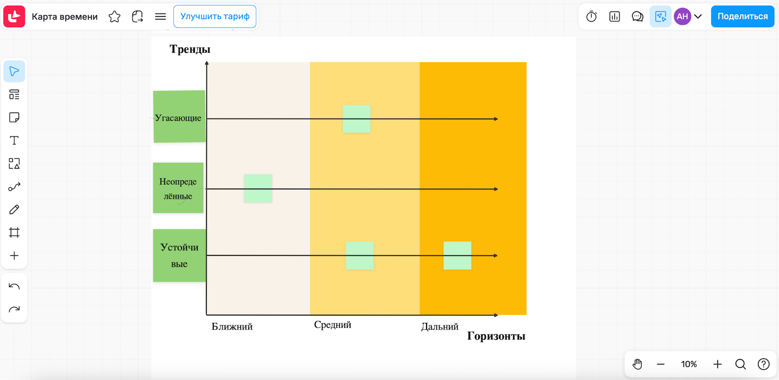 На форсайт-сессиях часто используют «карту времени». Её рисуют на большом листе, флипчарте или онлайн-доске. Карта времени представляет собой график с двумя осями: горизонты и тренды.