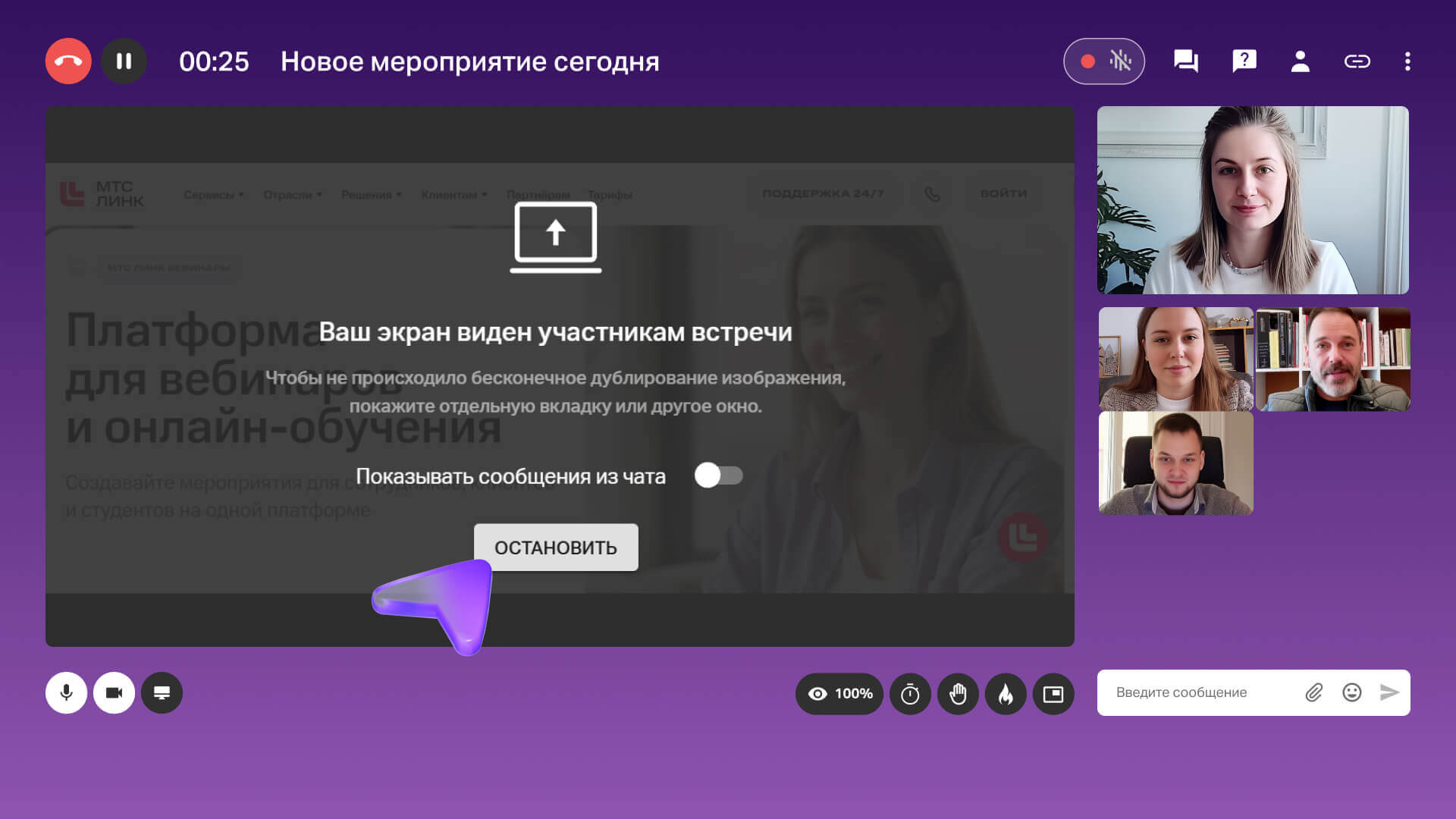 Как в сервисе МТС Линк Вебинары включить демонстрацию экрана