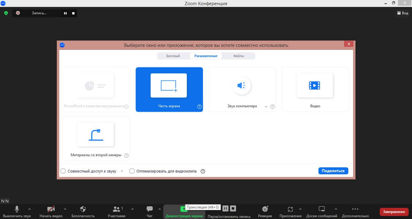 В открывшемся окне система предложит доступные режимы показа. Выделите вкладку и нажмите кнопку «Поделиться» чтобы транслировать изображение участникам встречи.