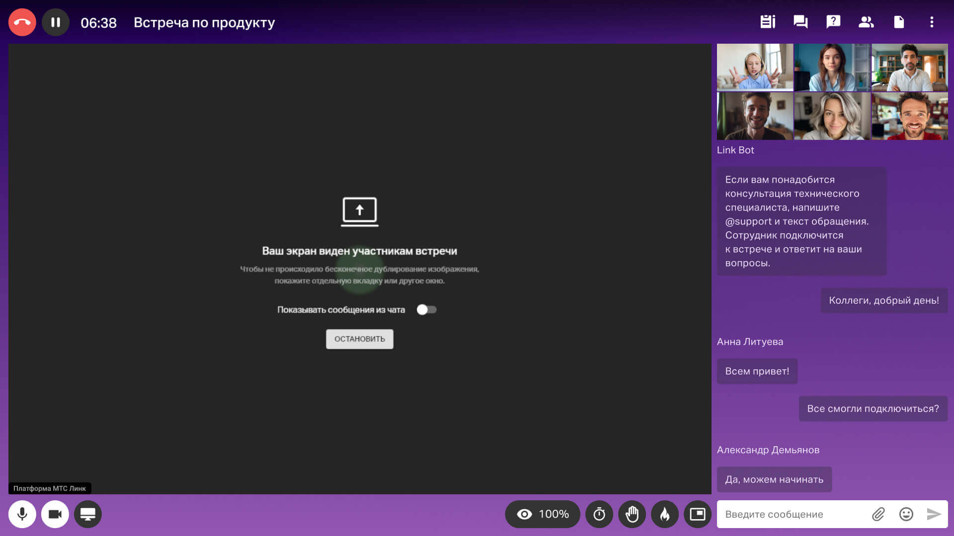Экран спикера в процессе скриншаринга на платформе МТС Линк