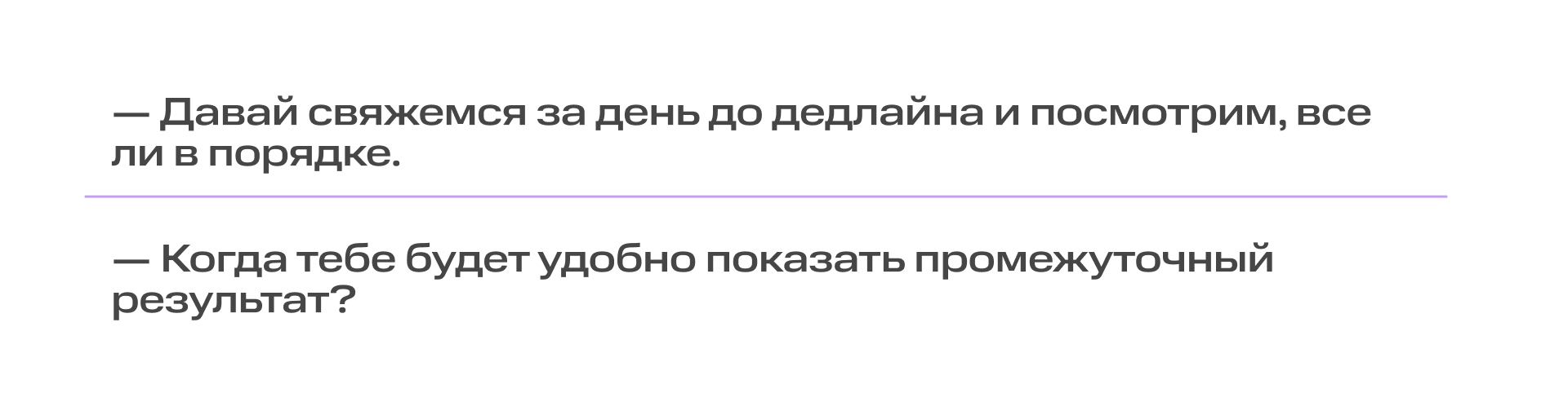 Например, если на задачу отведено четыре дня, договоритесь о промежуточном чекпоинте на третий день.