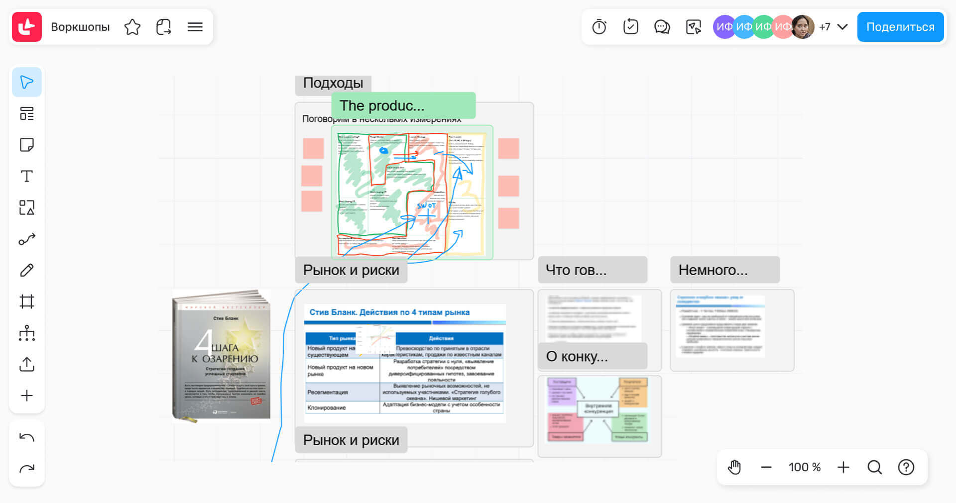 «Мы рассказывали, что такое Go-to-market, как с помощью шаблона выстроить стратегию вывода продукта, — говорит Ксения Макарова. — Всё объяснялось прямо на доске: можно было подсветить нужные блоки, сослаться на теорию, предложить участникам вписать свои идеи в стикеры. В итоге мы вместе заполнили шаблон и у всех остался понятный, наглядный результат».