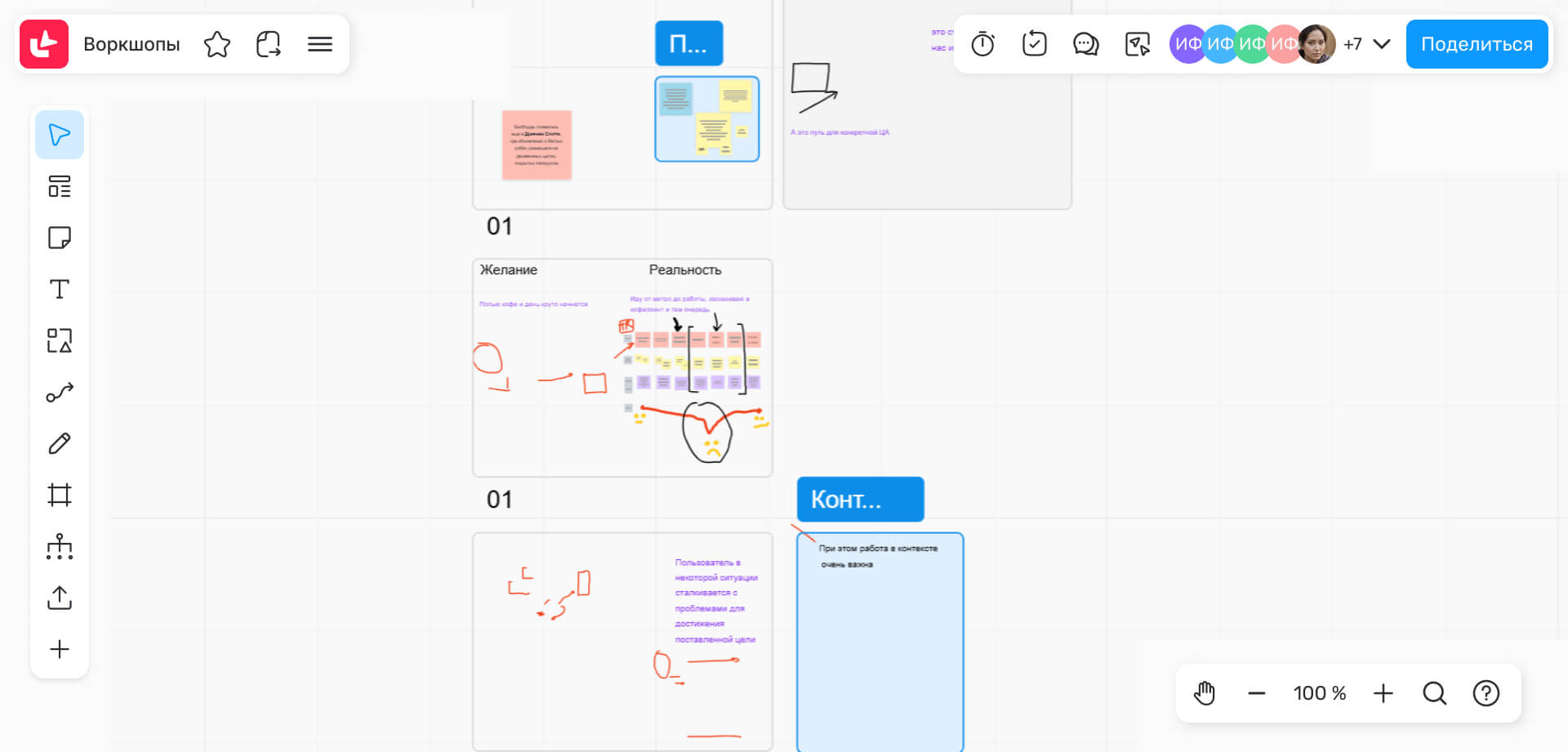 В другом воркшопе команда разбирала путь клиента, создавая Customer Journey Map прямо на доске. Участники вносили шаги пользователя и точки контакта, а модератор в режиме реального времени формировал итоговую карту. «Можно подключить всех к доске, разделить участников на группы и поручить каждой собрать свой участок пути. Потом все видят, как CJM складывается целиком, — делится Ксения. — Это не просто лекция, а совместная работа, где все вовлечены».