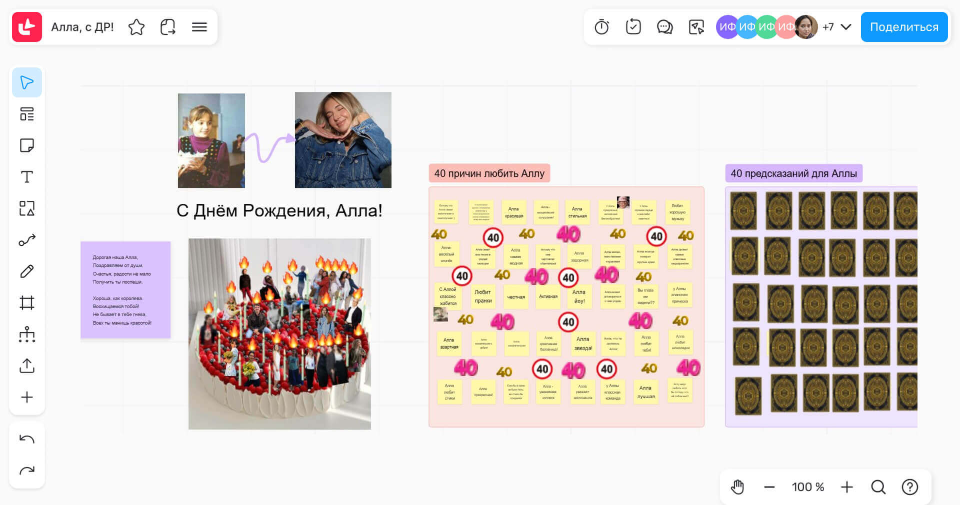 В МТС Линк Досках есть место не только для рабочих процессов, но и для творческих традиций. Команда маркетинга использует доски, чтобы поздравлять коллег с днём рождения — создаёт креативные визуальные «стенгазеты» с мемами, картинками и личными пожеланиями. Каждая такая доска — отражение личности именинника и фантазии команды: кто-то оформляет её как лендинг, кто-то — как коллаж эмоций. Это неформальный, но очень тёплый способ поддерживать атмосферу единства и креатива даже в распределённой команде.