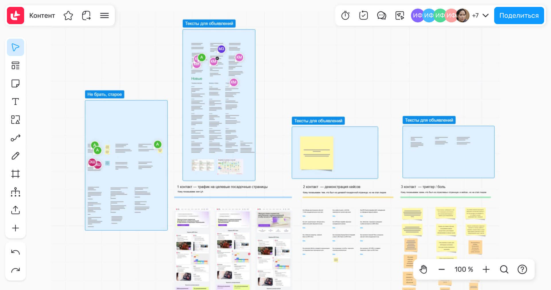 Любые идеи и этапы работы становятся наглядными: карточки, связи между задачами, статусы, визуальные заметки. «Маркетинг — это всегда про концепции, про то, чтобы что-то показать, собрать идею в единое представление, — отмечает Ксения Макарова. — В Google Документах это сделать сложно: там ограниченные визуальные возможности. А в досках ты буквально видишь, как проект оживает».