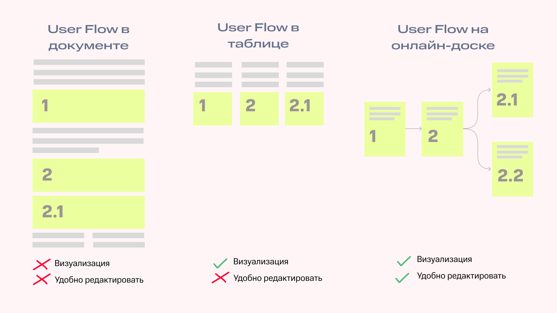 Работать с подобными картами в документах и таблицах не просто неудобно, а часто даже невозможно. Есть шанс, что вы пропустите важные шаги, а указанные правки от коллег потеряются. Двигать карточки и элементы интерфейса на онлайн-доске гораздо проще и нагляднее.