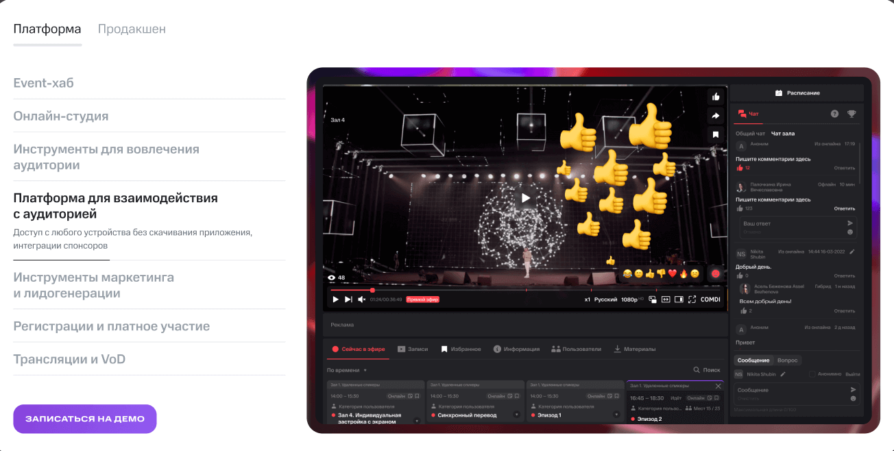 В уникальном плеере COMDI есть интерактивные функции: чат, опросы, голосования и брендирование под стиль заказчика. Платформа легко масштабируется и подходит для мероприятий любого уровня, включая трансляции на десятки тысяч участников.