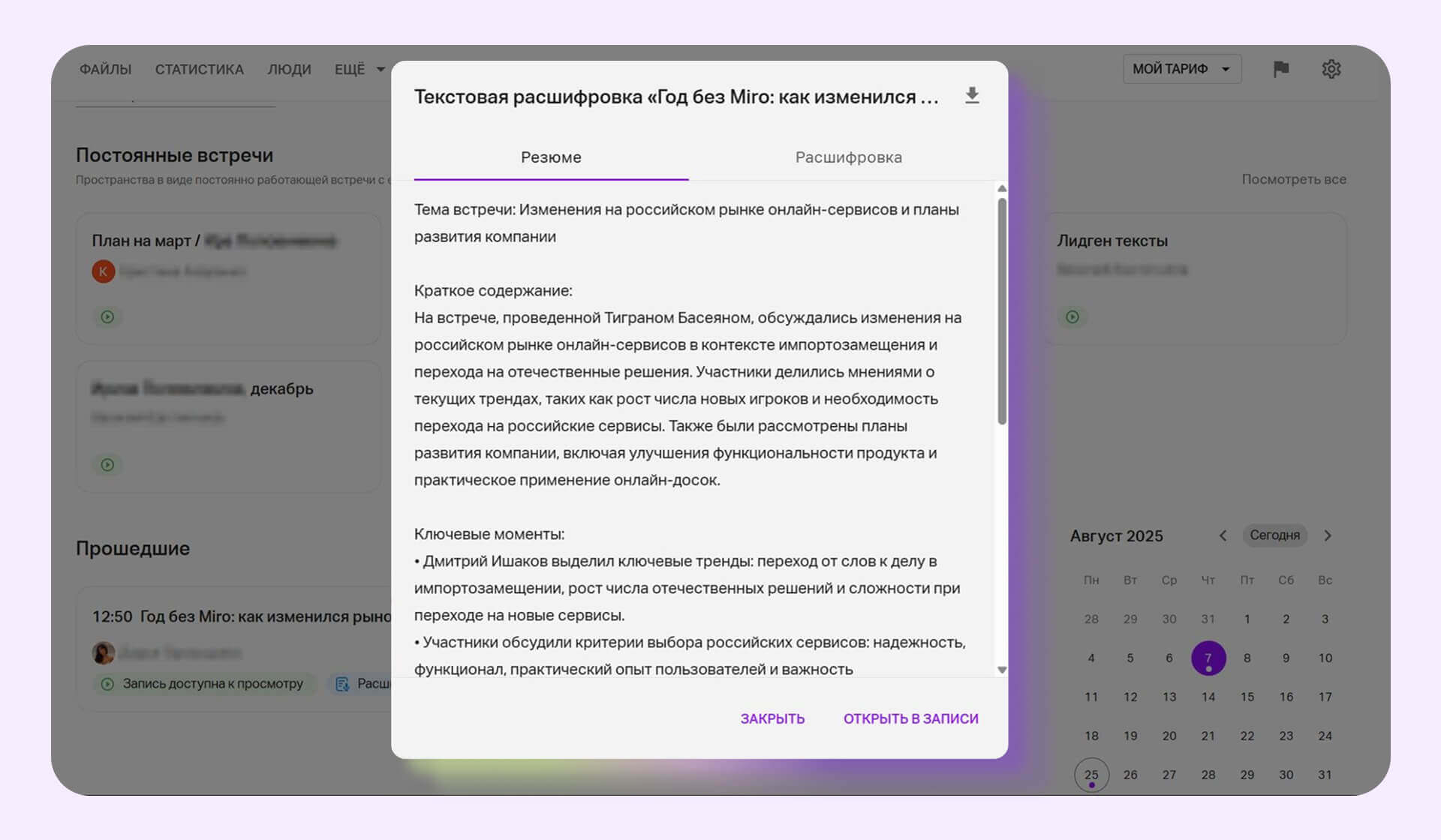 Если нужны детали, откройте запись встречи или вкладку «Расшифровка» с полным текстом обсуждения.