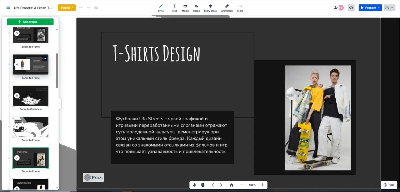 Условно бесплатная платформа для нелинейных презентаций с эффектом зума. Она позволяет свободно перемещаться между элементами, меняя структуру повествования в зависимости от ситуации. Сервис поддерживает добавление текста, изображений, видео, аудио и анимации.