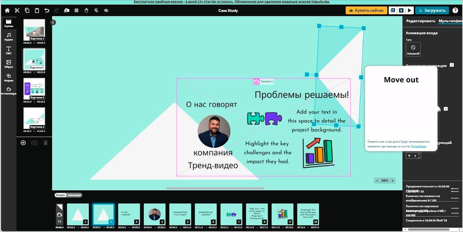 Оригинальное решение, как сделать видео с презентацией и лицом спикера в формате дудл-видео. В VideoScribe можно создавать ролики с эффектом скрайбинг-анимации (с добавлением графических элементов, имитирующих рисунки от руки). Программа доступна в онлайн-версии, но удобнее установить софт на компьютер.