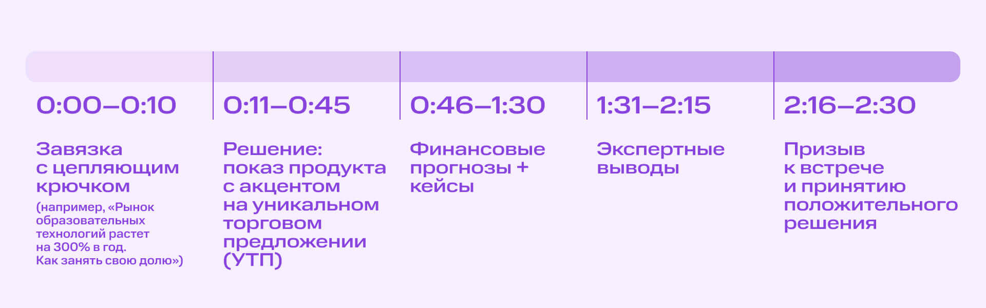 Разбейте структурные части на небольшие блоки и пропишите тайминг. Например, если вы делаете видео для инвесторов, вы можете использовать следующую посекундную схему.