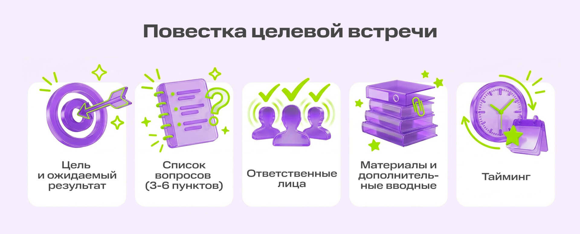 По словам Екатерины Елизаровой, при составлении повестки важно фиксировать конкретные запросы, потому что многие допускают одну и ту же ошибку: формулируют вопросы не как задачи, а как темы.