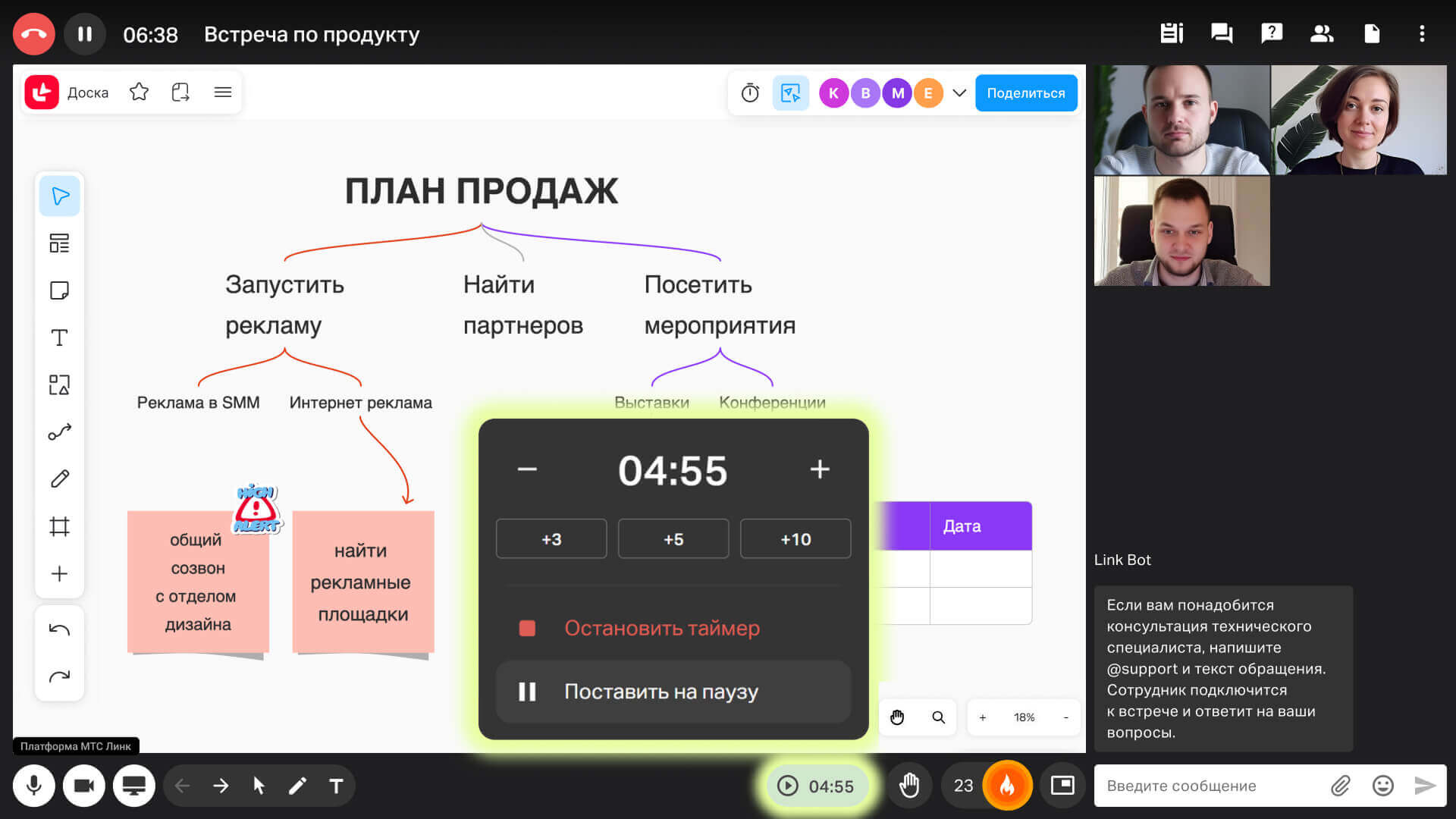 Многие сервисы для видеозвонков на работе предлагают встроенные функции контроля времени. Включать таймер можно и во время созвонов в МТС Линк Встречах. Инструмент помогает придерживаться отведённого времени для выступления спикера, презентации, брейнсторма и других задач.