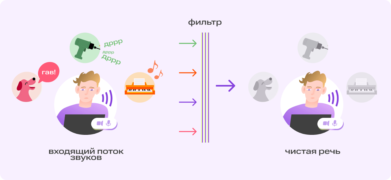 Суть технологии в следующем: когда человек что-то говорит в микрофон, система автоматически убирает посторонние шумы и оставляет только звук речи. Благодаря этому собеседники хорошо слышат то, что сказал коллега. Даже если сначала в комнате была тишина, а затем внезапно возник громкий шум при видеозвонке (например, сосед включил перфоратор), встроенные алгоритмы быстро отреагируют и приглушат посторонний шум. Система может не только устранить посторонние звуки, но и улучшить качество речи, например, сделать её более разборчивой при перебоях с интернетом.