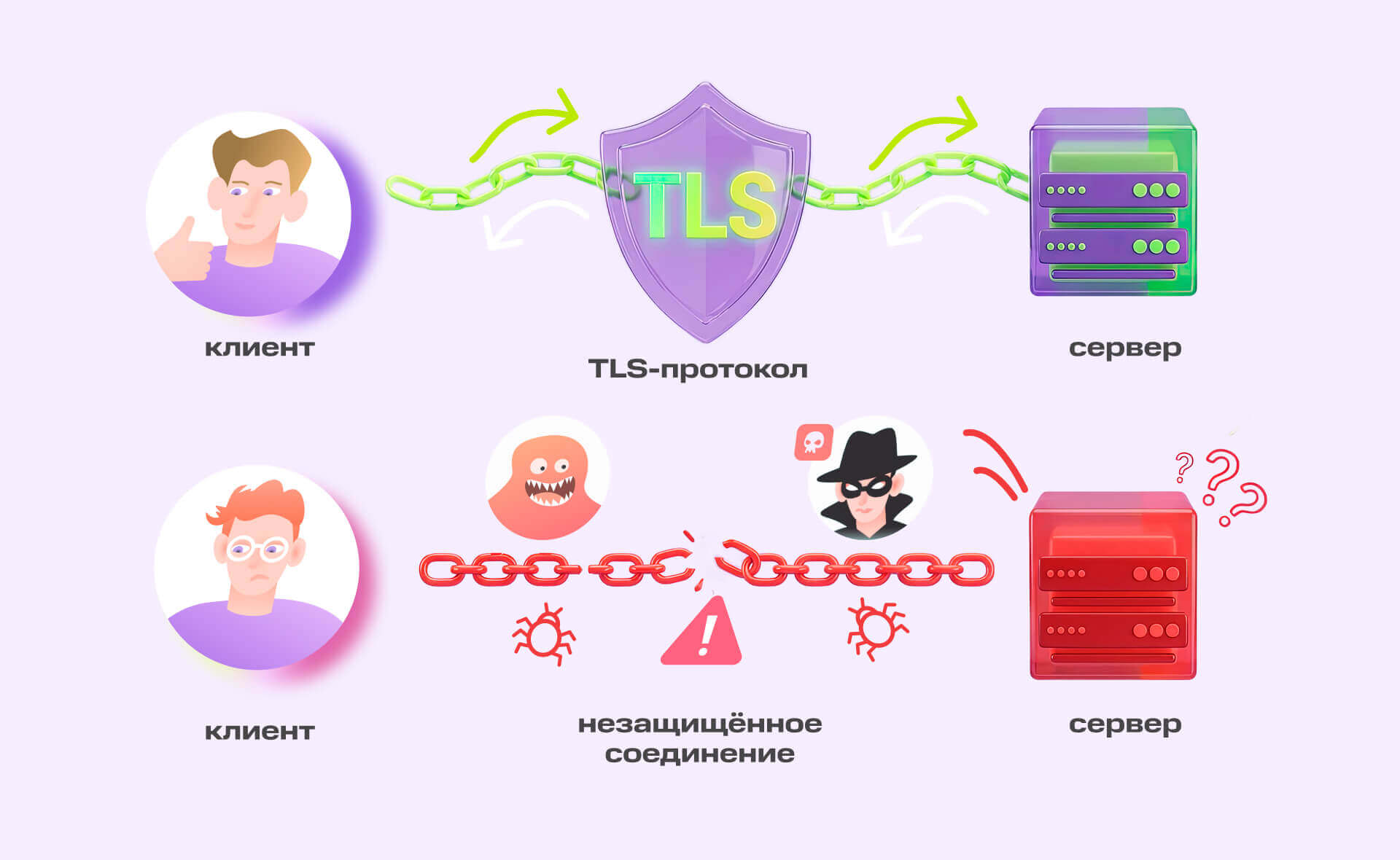 С ним шифрование выглядит так: TLS создаёт во время передачи данных специальный канал, где информацию нельзя прочитать или изменить без специального ключа. Протокол защищает именно процесс передачи. Даже если злоумышленник получит доступ к сетевому трафику, он увидит лишь набор зашифрованных символов, а не содержимое переписки.