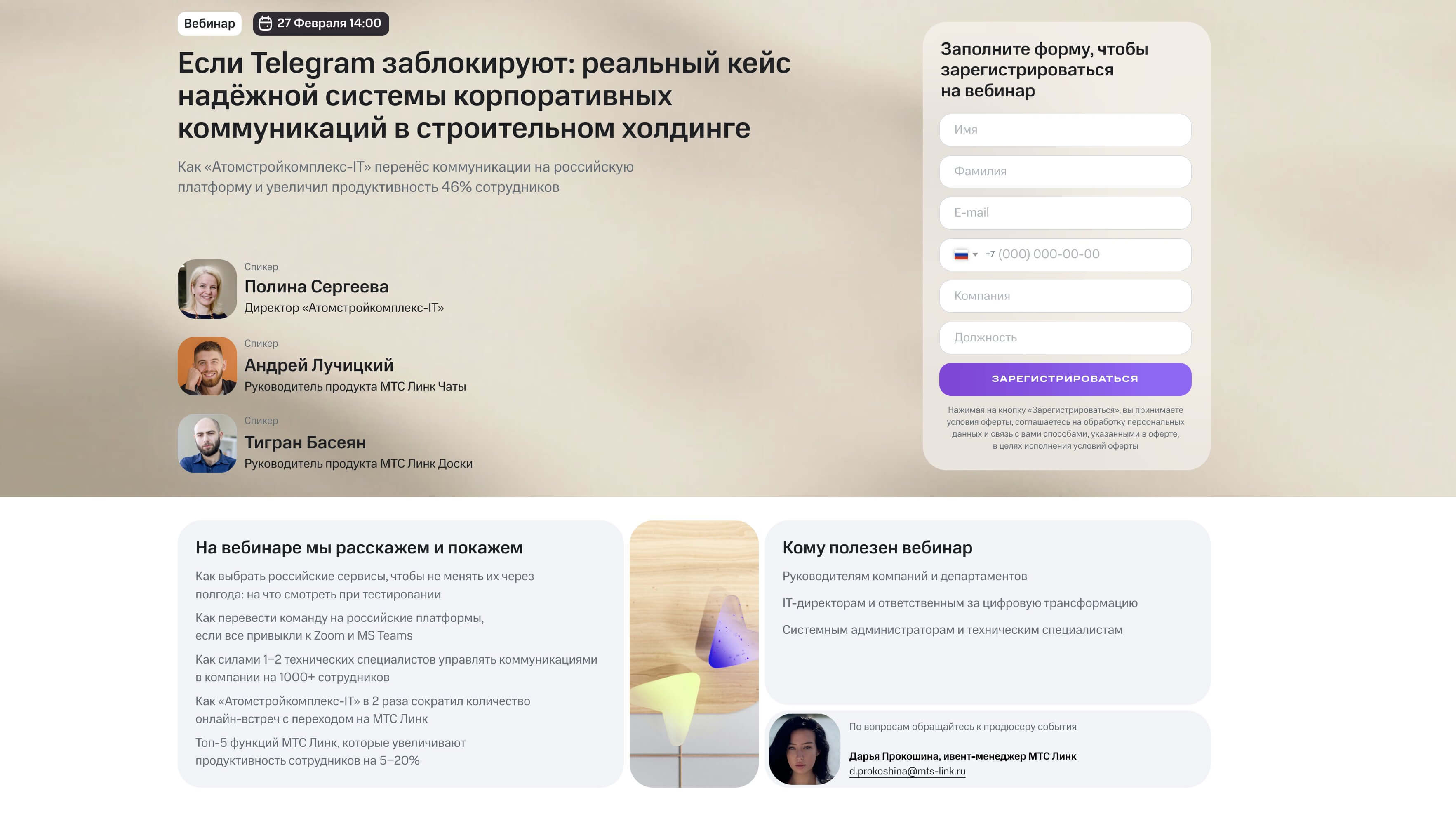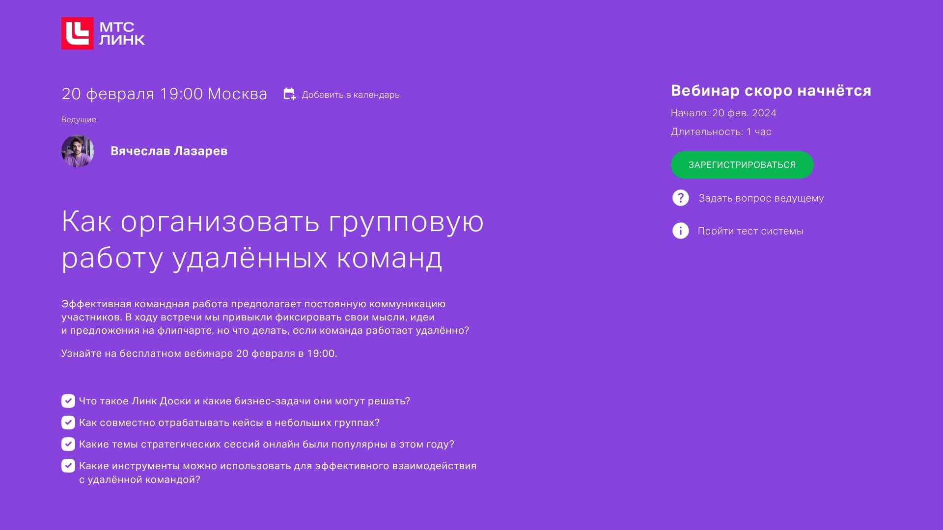 Пользователь регистрируется на лендинге сервиса МТС Линк Вебинары