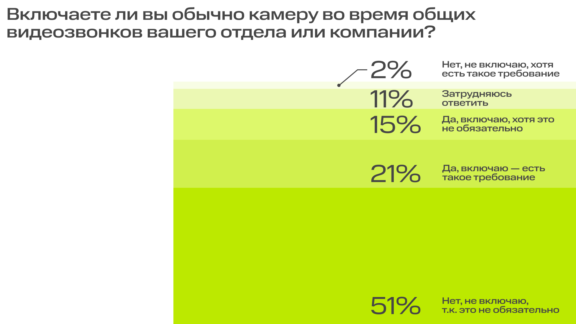 Согласно опросу, больше половины сотрудников подключаются к онлайн-совещаниям без камер, так как у работодателя нет чёткого регламента на этот счёт. 2% сотрудников не пользуются камерой, даже если это нарушает правила, установленные компанией. 36% респондентов включают камеры во время видеозвонков.