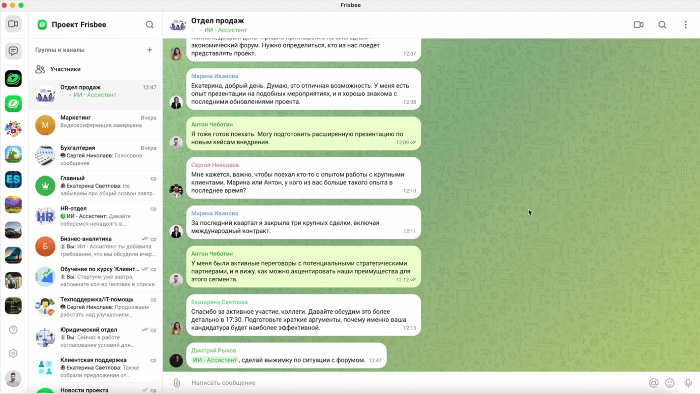 МТС Линк Чаты — собственный корпоративный мессенджерот МТС Линк, в котором можно совершать звонки как один на один, так и командой. Он создан, чтобы помогать командам выстраивать коммуникации, работать в группах и продуктивно взаимодействовать, не отвлекаясь на информационный шум. Например, вы можете использовать ИИ-помощника, чтобы получать итоги обсуждений, работать в группах для отделов и проектов, приглашать гостей, создавать из сообщений задачи и взаимодействовать с внешними сервисами через чат-ботов.