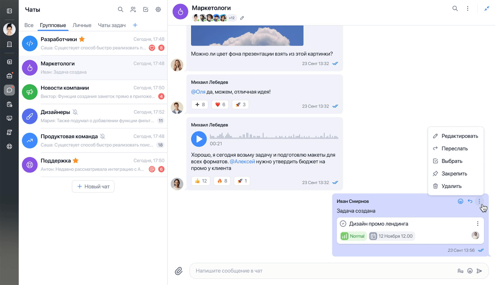 МТС Линк Чаты — корпоративный мессенджер от МТС Линк, в котором можно совершать звонки как один на один, так и командой. Он создан, чтобы помогать командам выстраивать коммуникации, работать в группах и продуктивно взаимодействовать, не отвлекаясь на информационный шум. Например, вы можете использовать ИИ-помощника, чтобы получать итоги обсуждений, работать в группах для отделов и проектов, приглашать гостей, создавать из сообщений задачи и взаимодействовать с внешними сервисами через чат-ботов.